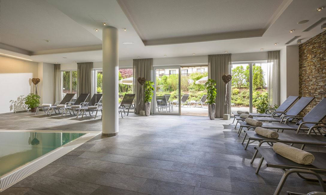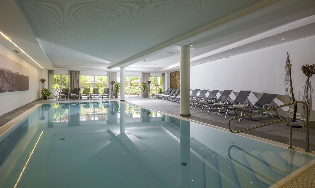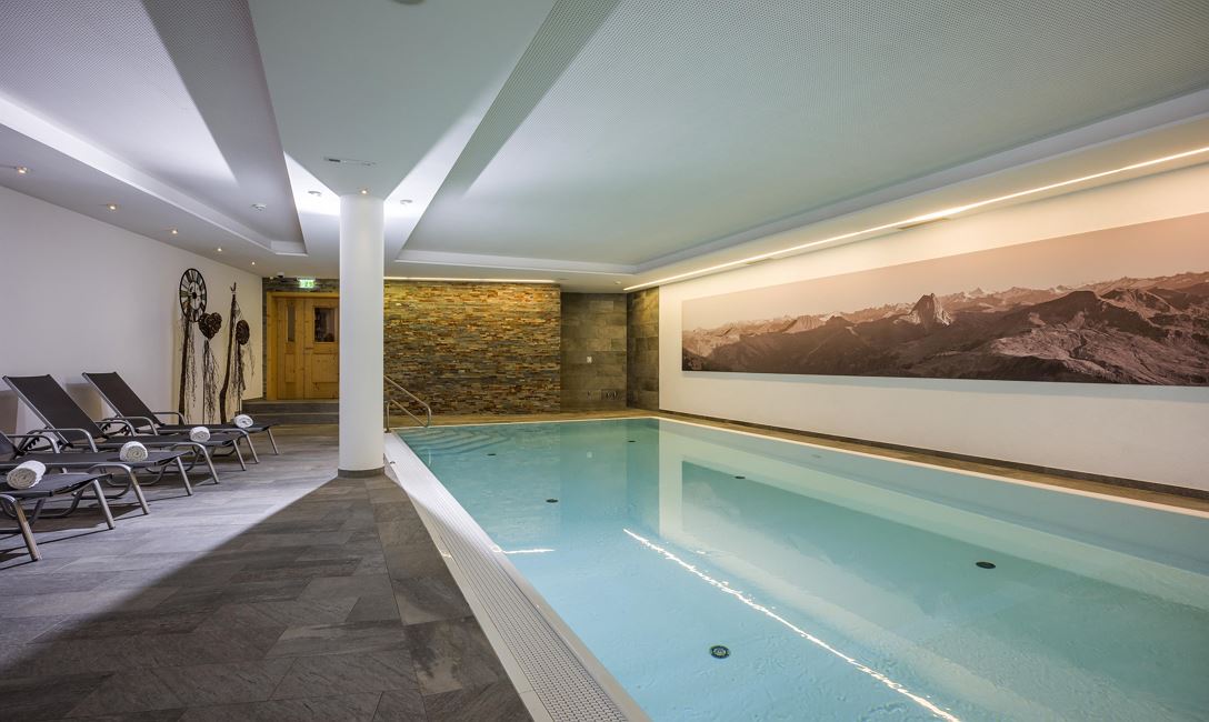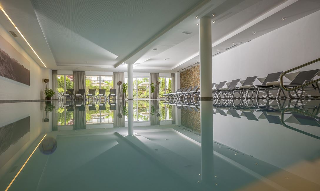 Der lichtdurchflutete Pool mit Panoramascheibe und direktem Zugang zur Terrasse vermittelt das Gefühl eines Gebirgssees. Hier kann die Leichtigkeit des Wassers erlebt und der Alltag hinter sich gelassen werden. Ergänzend stehen Massagen im Raum „Balance“ und Beautybehandlungen im Raum „Erlebnis“ zur Verfügung.
