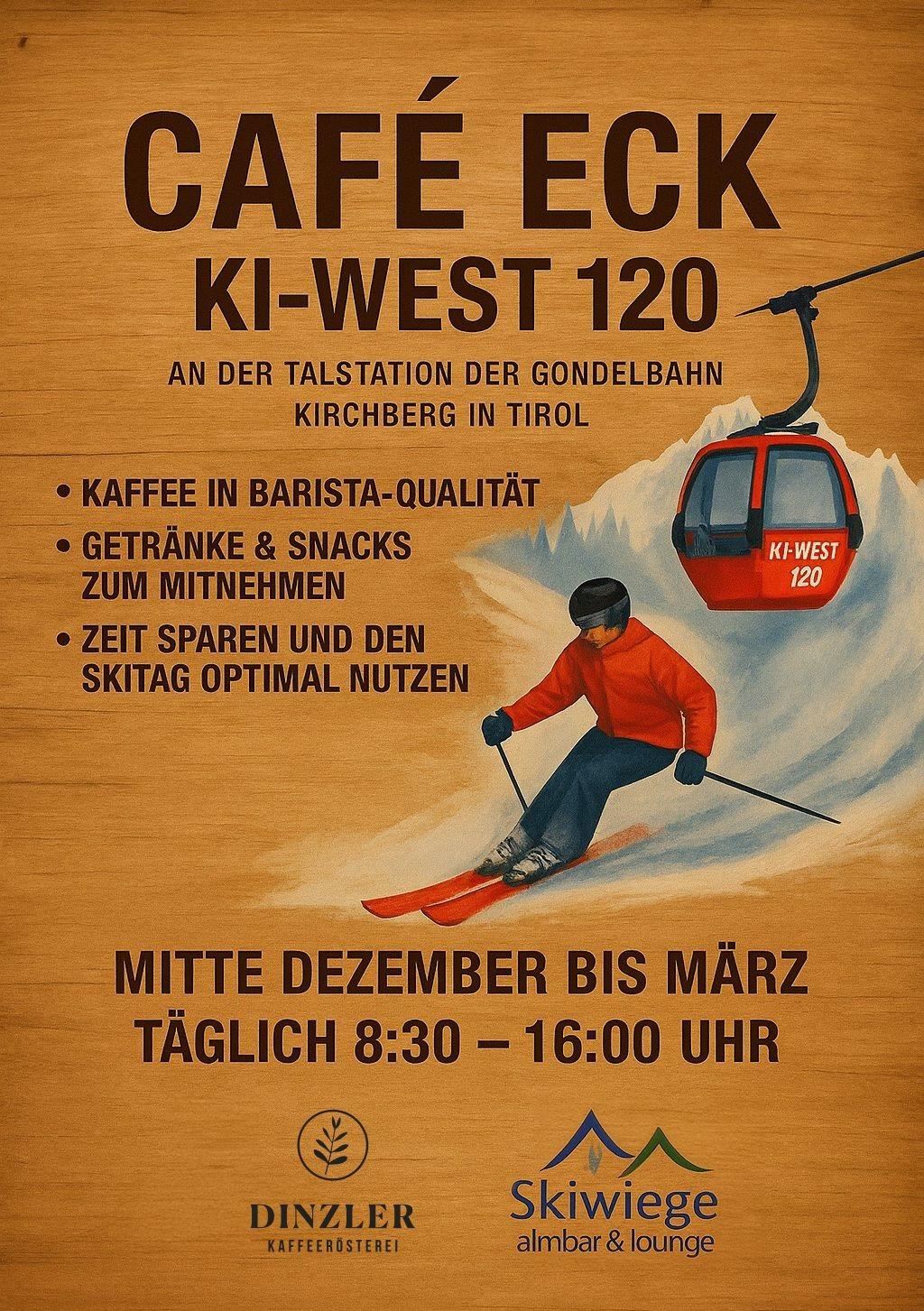 Das Café Eck KI-West 120 befindet sich direkt an der Talstation der Gondelbahn Kirchberg in Tirol und bietet einen idealen Start in den Skitag.