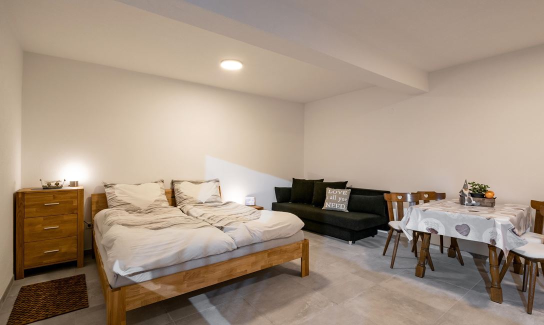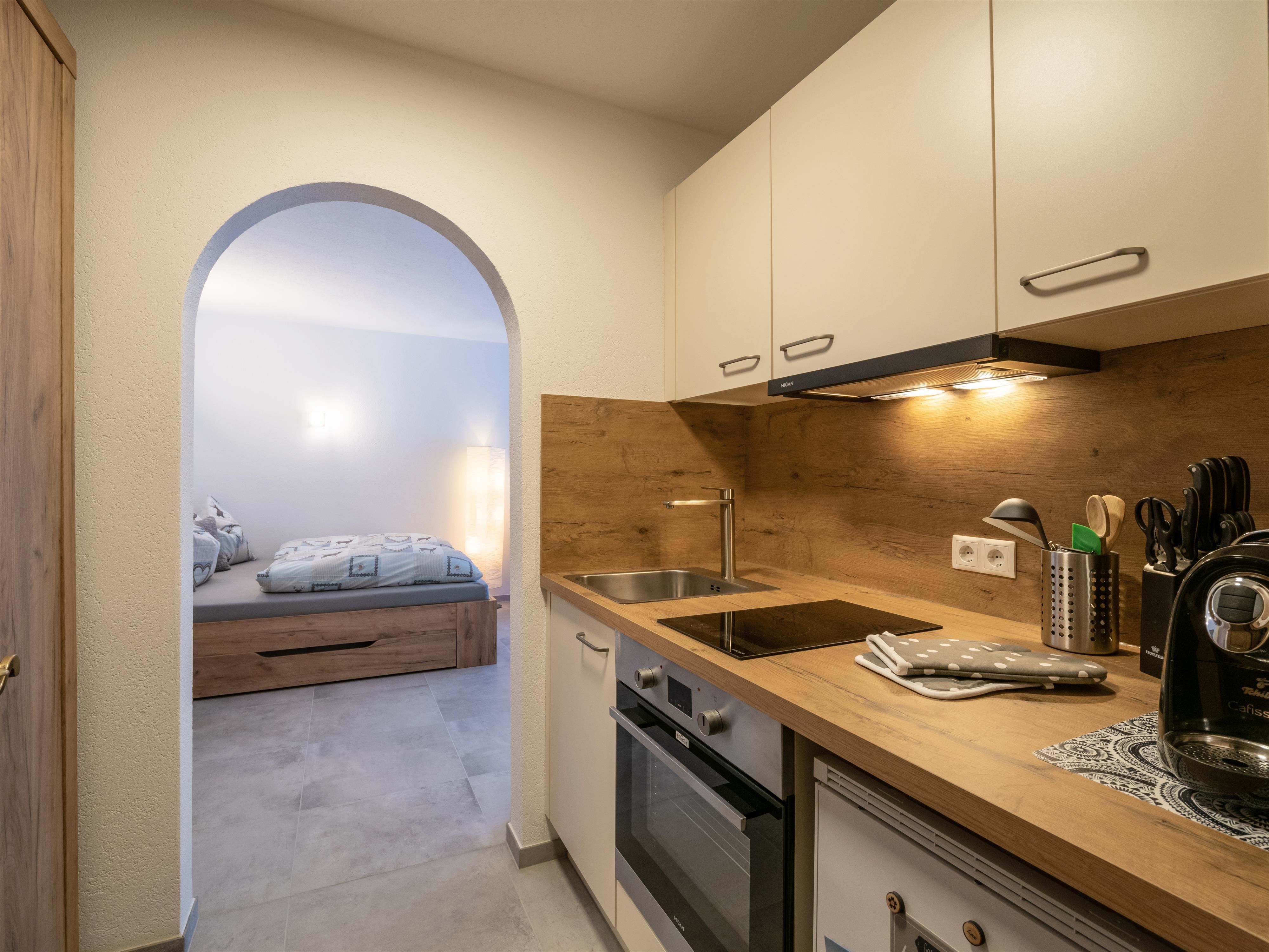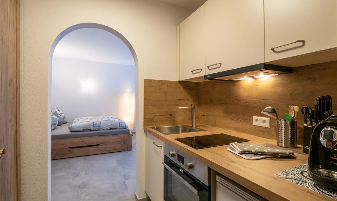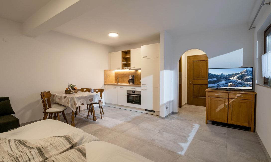 Die Appartments verfügen über einen eigenen Eingang, eine Wohnküche mit TV und ein Badezimmer.