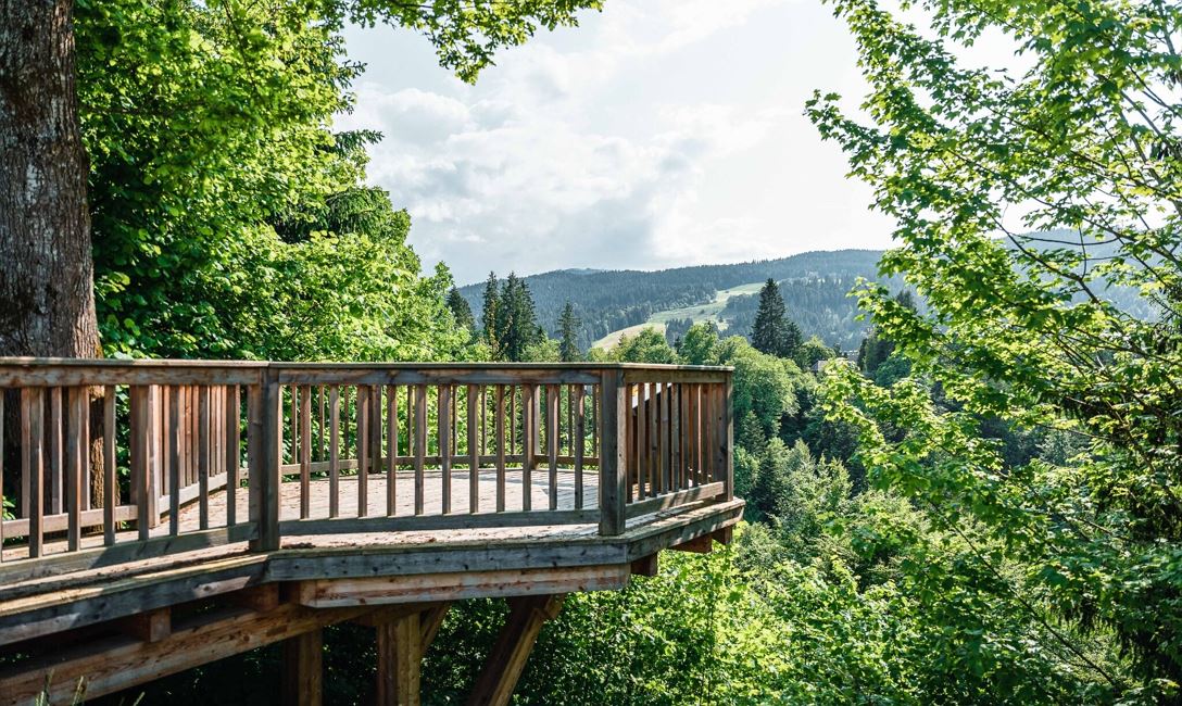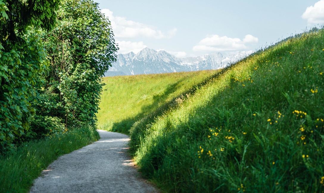 Dort wandert man bergauf durch den Wald bis zur Asphaltstraße. Diese überquert man und wandert weiter durch schattenspendenden Wald zur nächsten Straße. Dieser folgt man dann bergab zum Ortsteil Schlossblick. Nun folgt man der Beschilderung 'Hopfgarten ü. Hacha'.