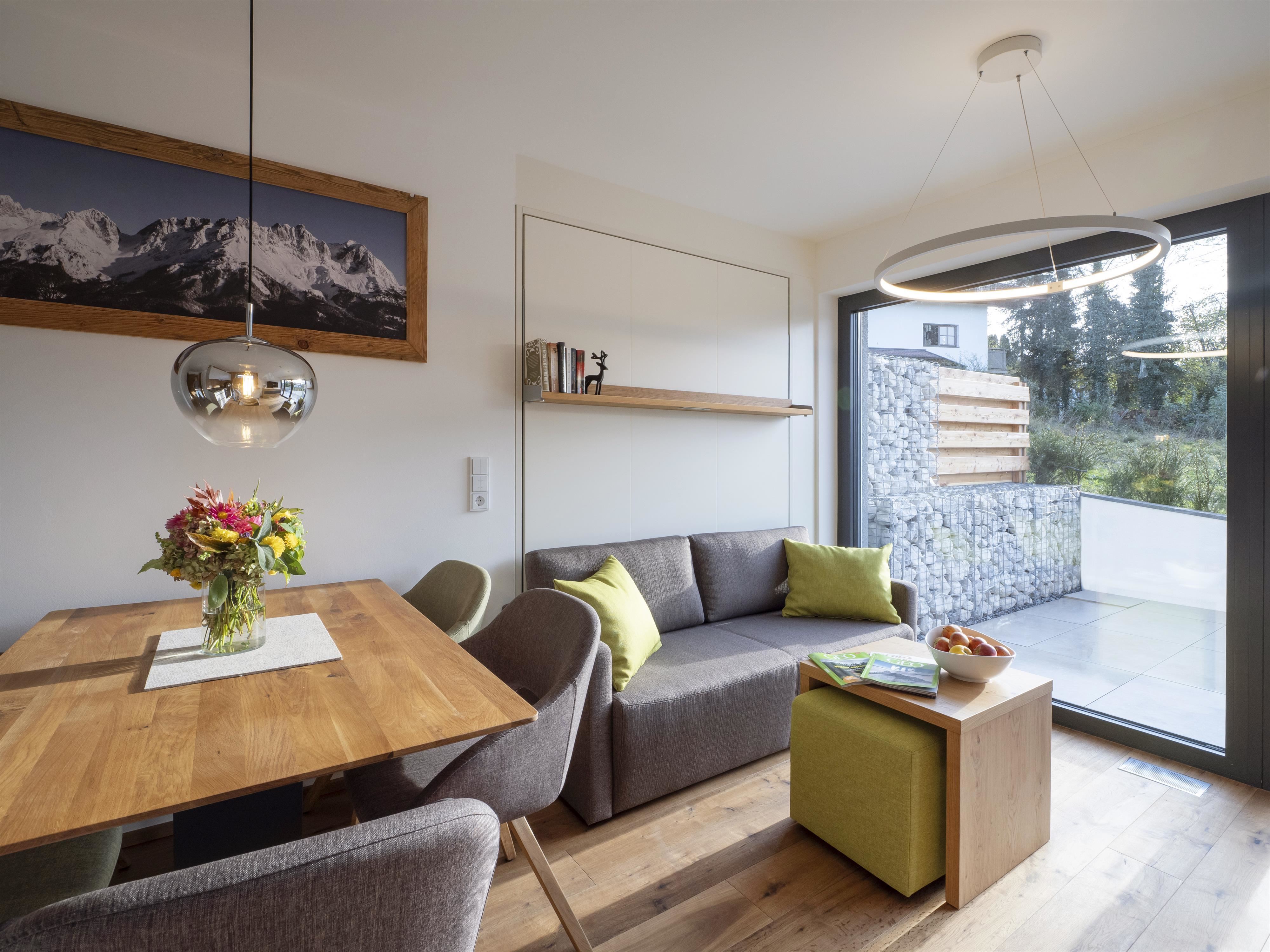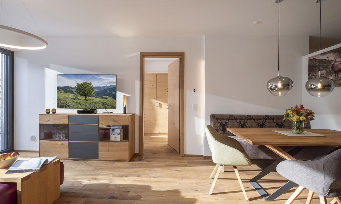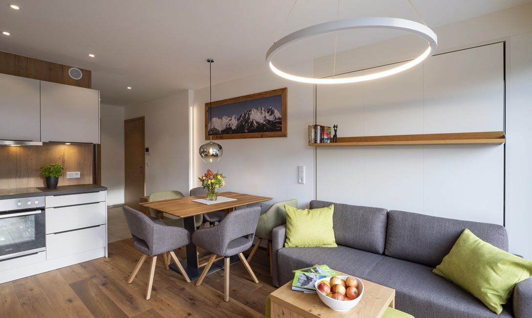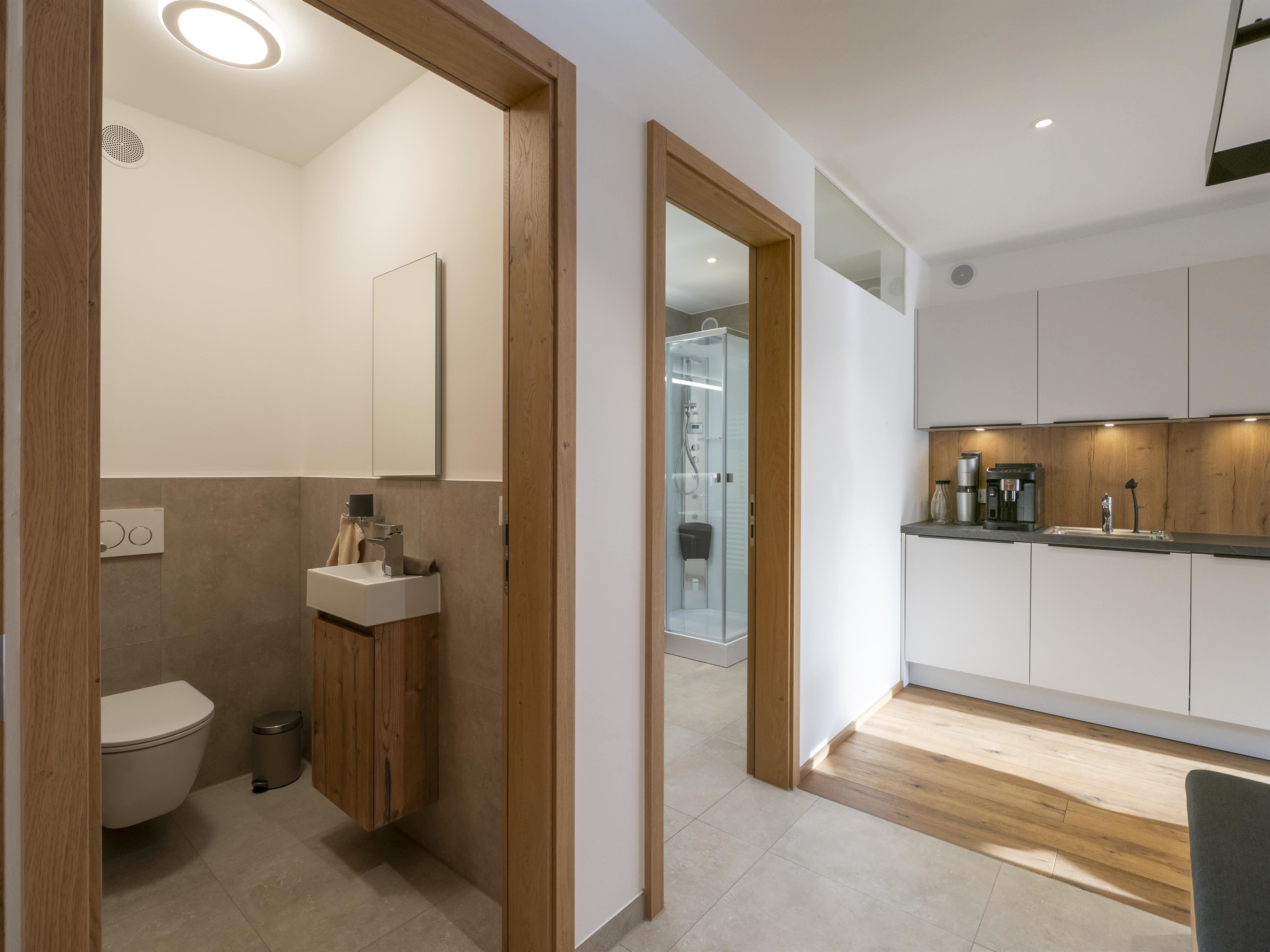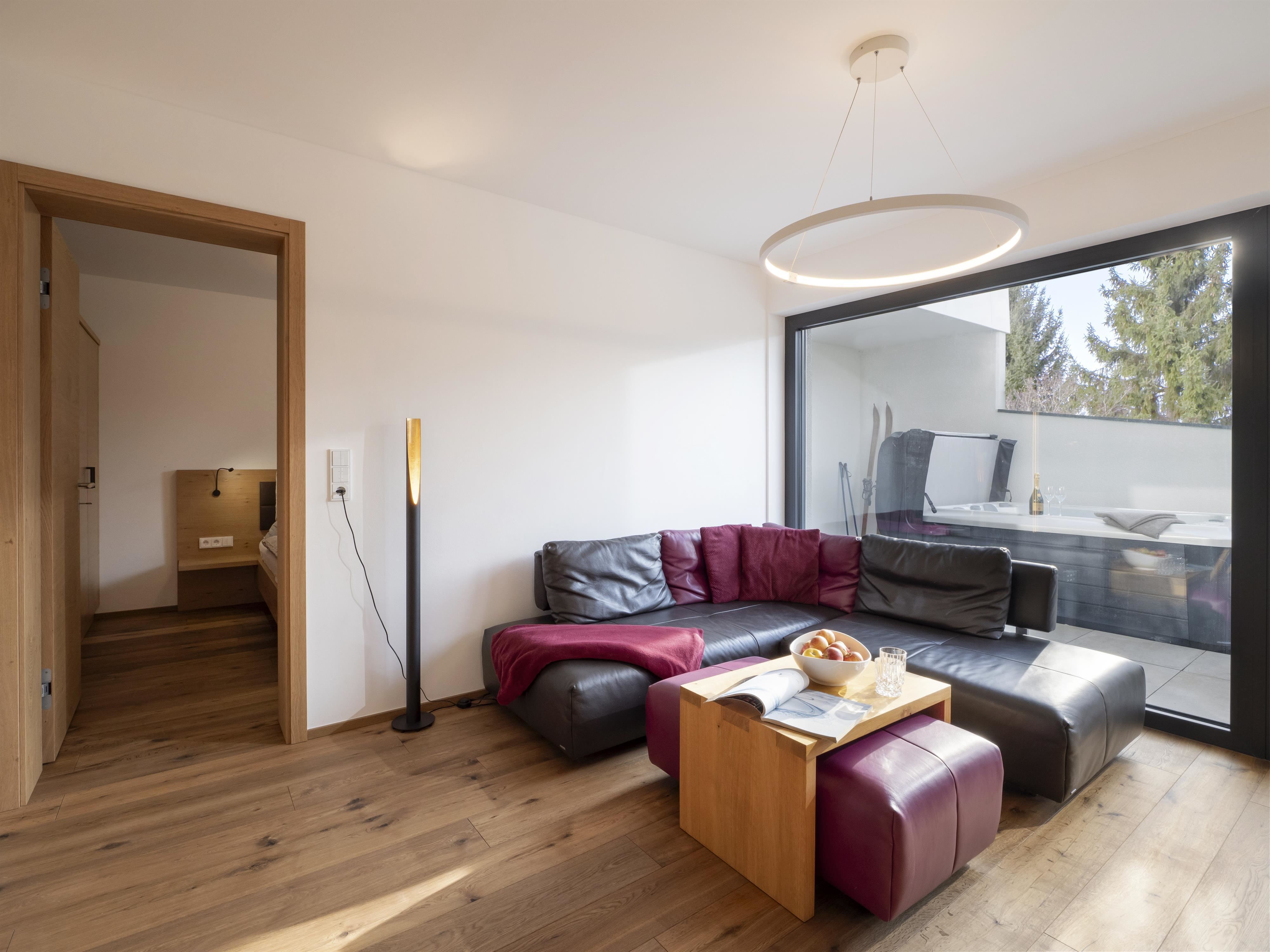 Unser Appartement "Koasa" verfügt über einen privaten Whirlpool auf der Terrasse, ein Schlafzimmer mit einem Doppelbett, ein Wohn- und Schlafraum mit einem Doppel-Wandbett und einem Badezimmer mit Dampfdusche.