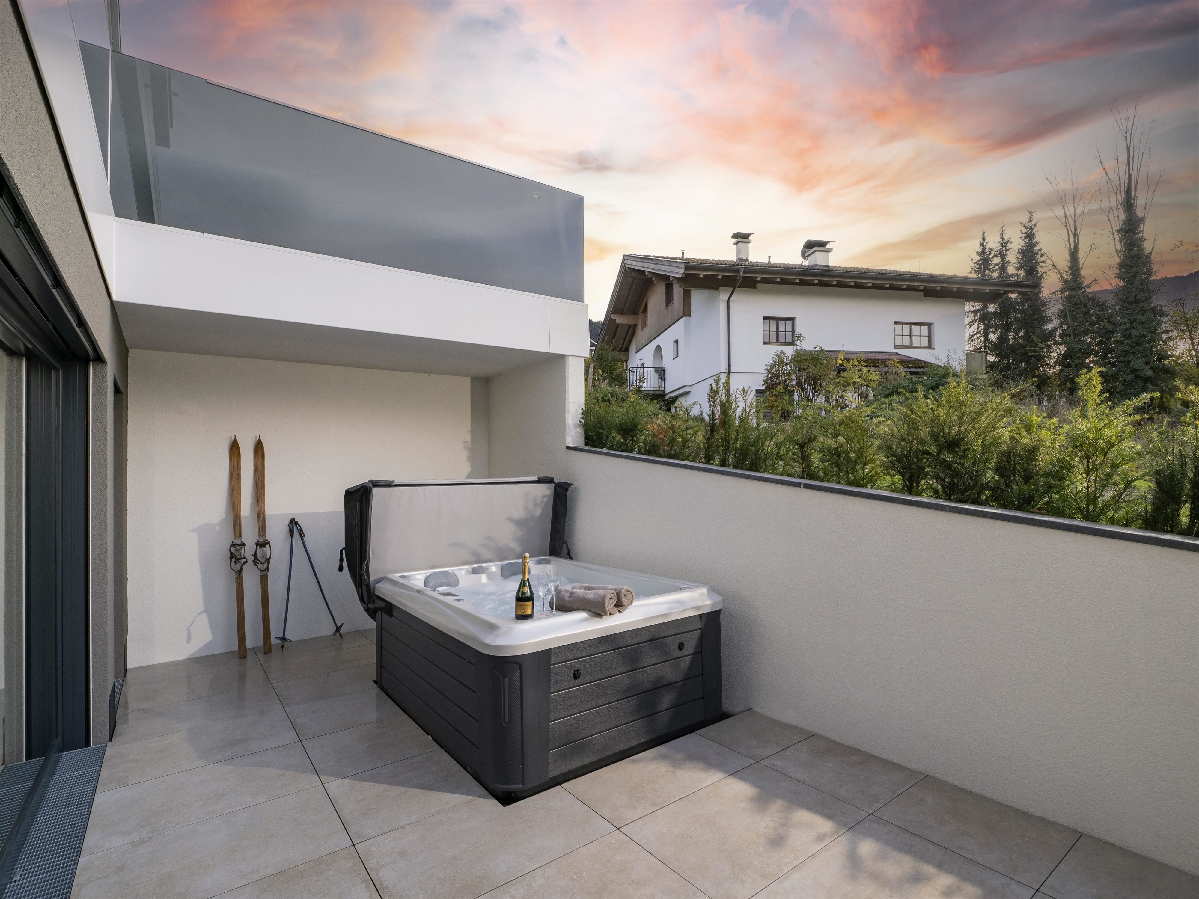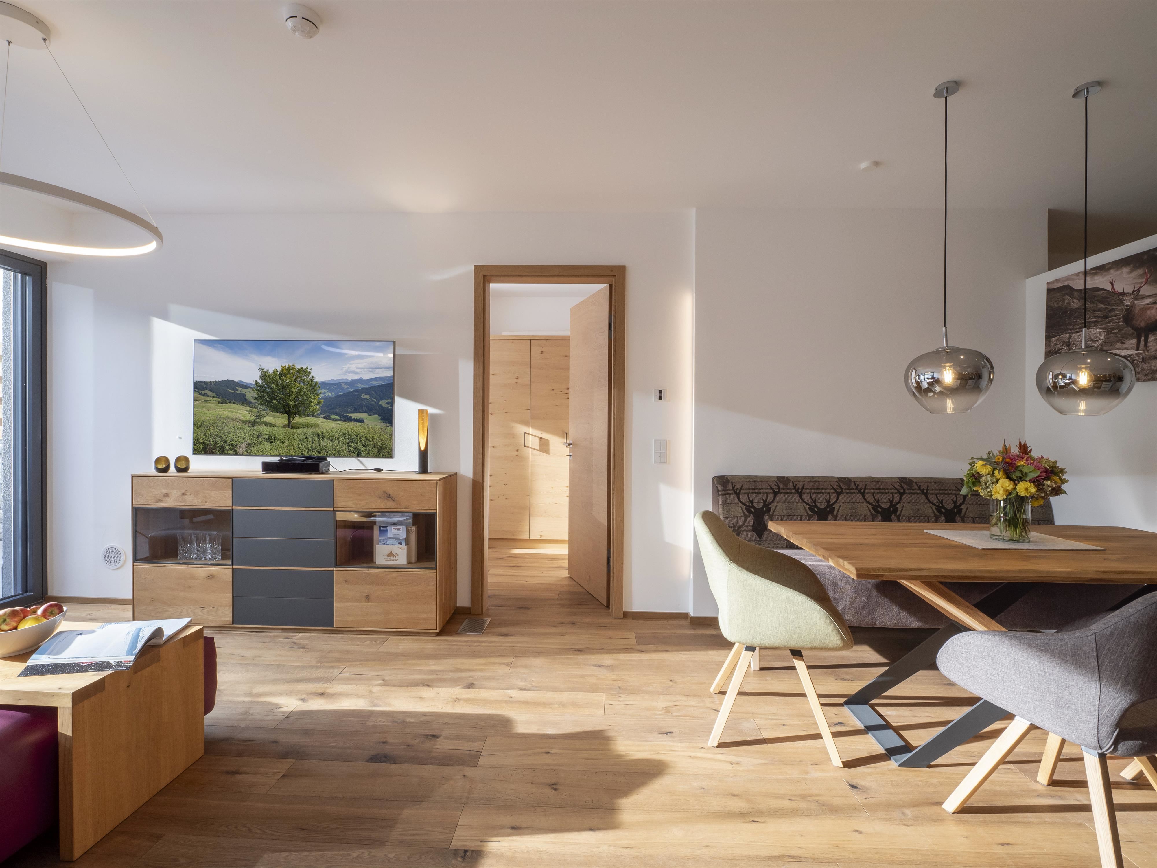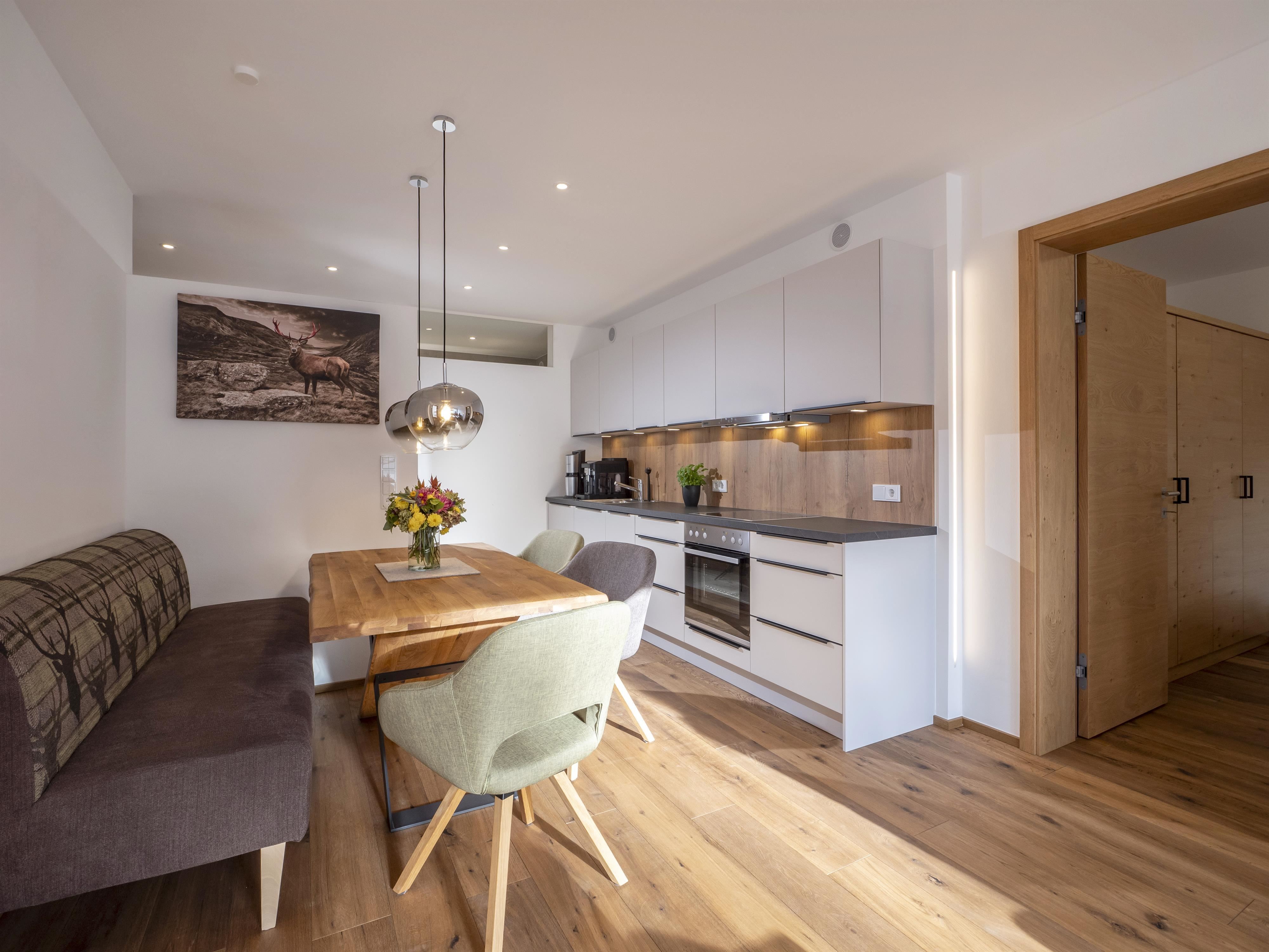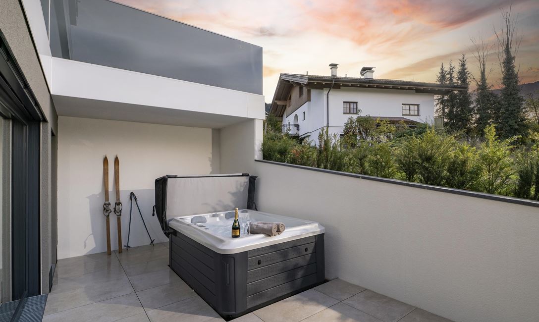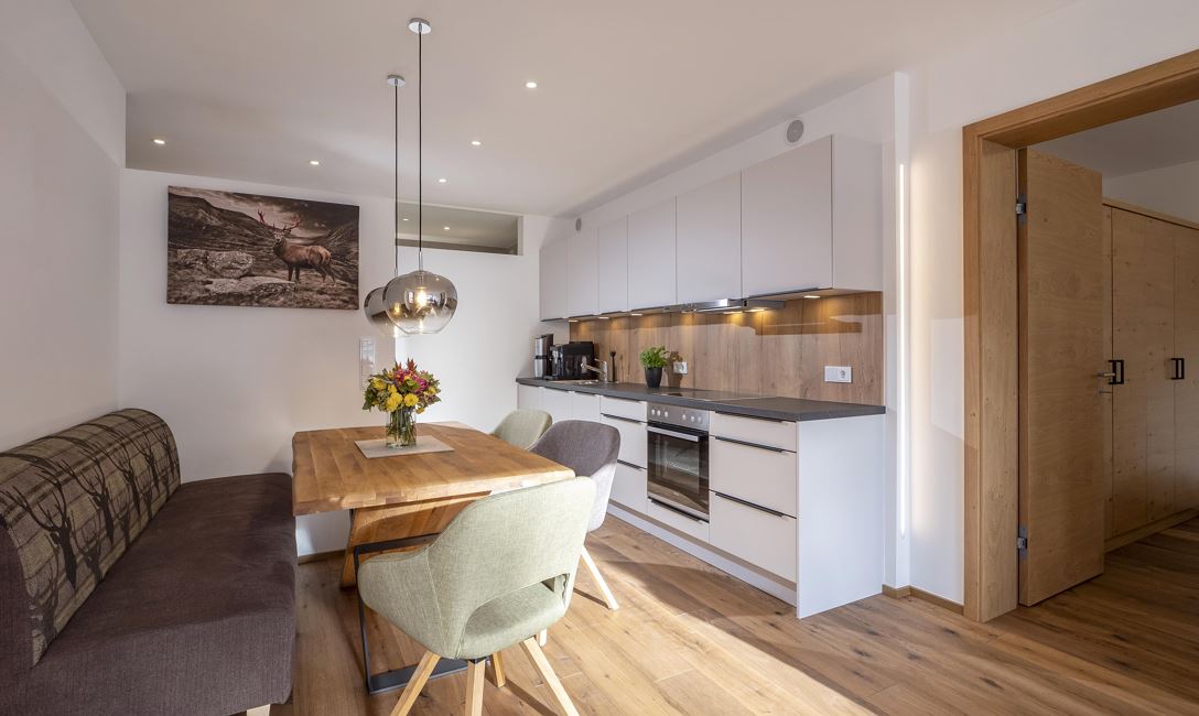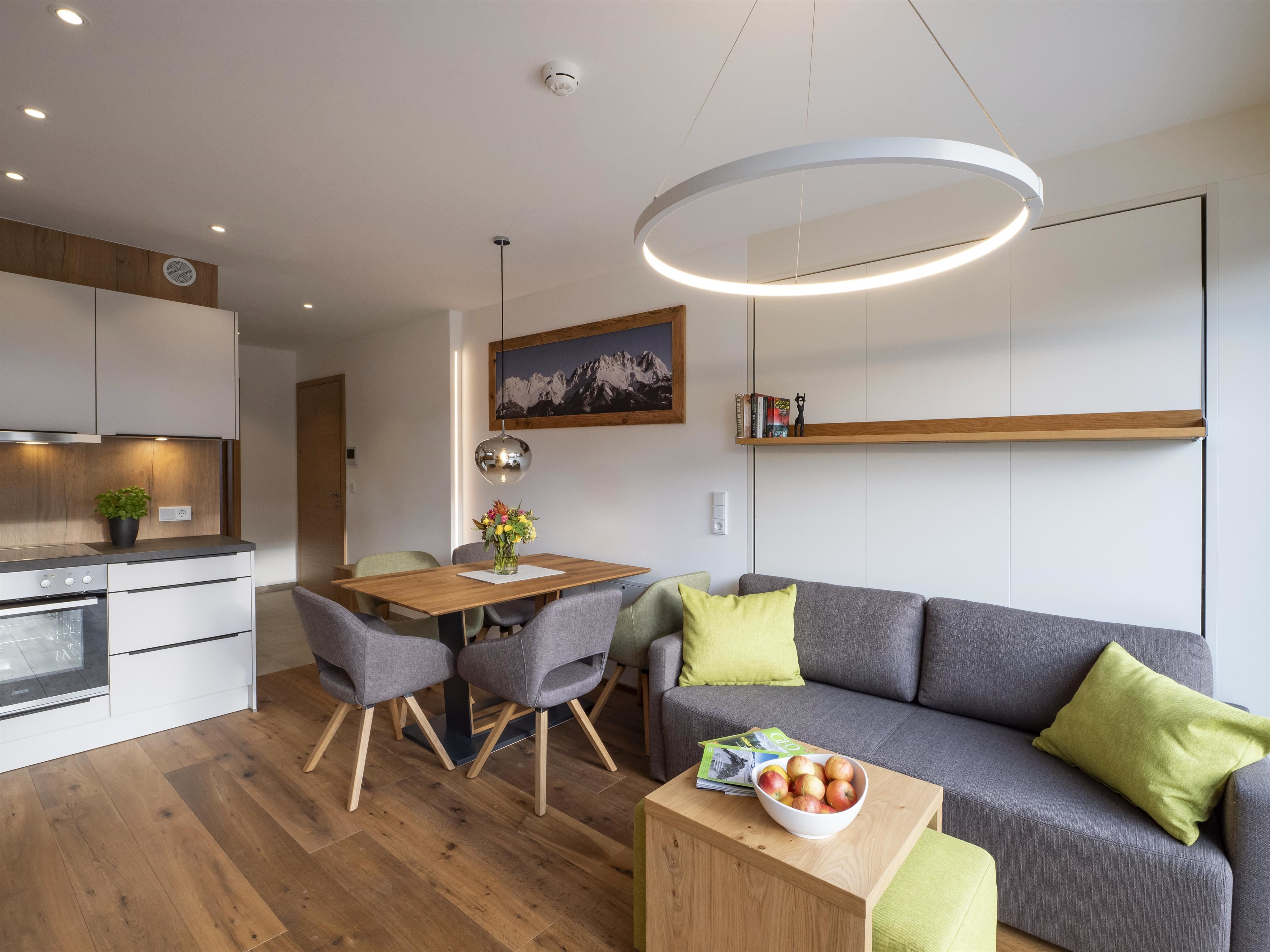 Unser Appartement "Koasa" verfügt über einen privaten Whirlpool auf der Terrasse, ein Schlafzimmer mit einem Doppelbett, ein Wohn- und Schlafraum mit einem Doppel-Wandbett und einem Badezimmer mit Dampfdusche.
