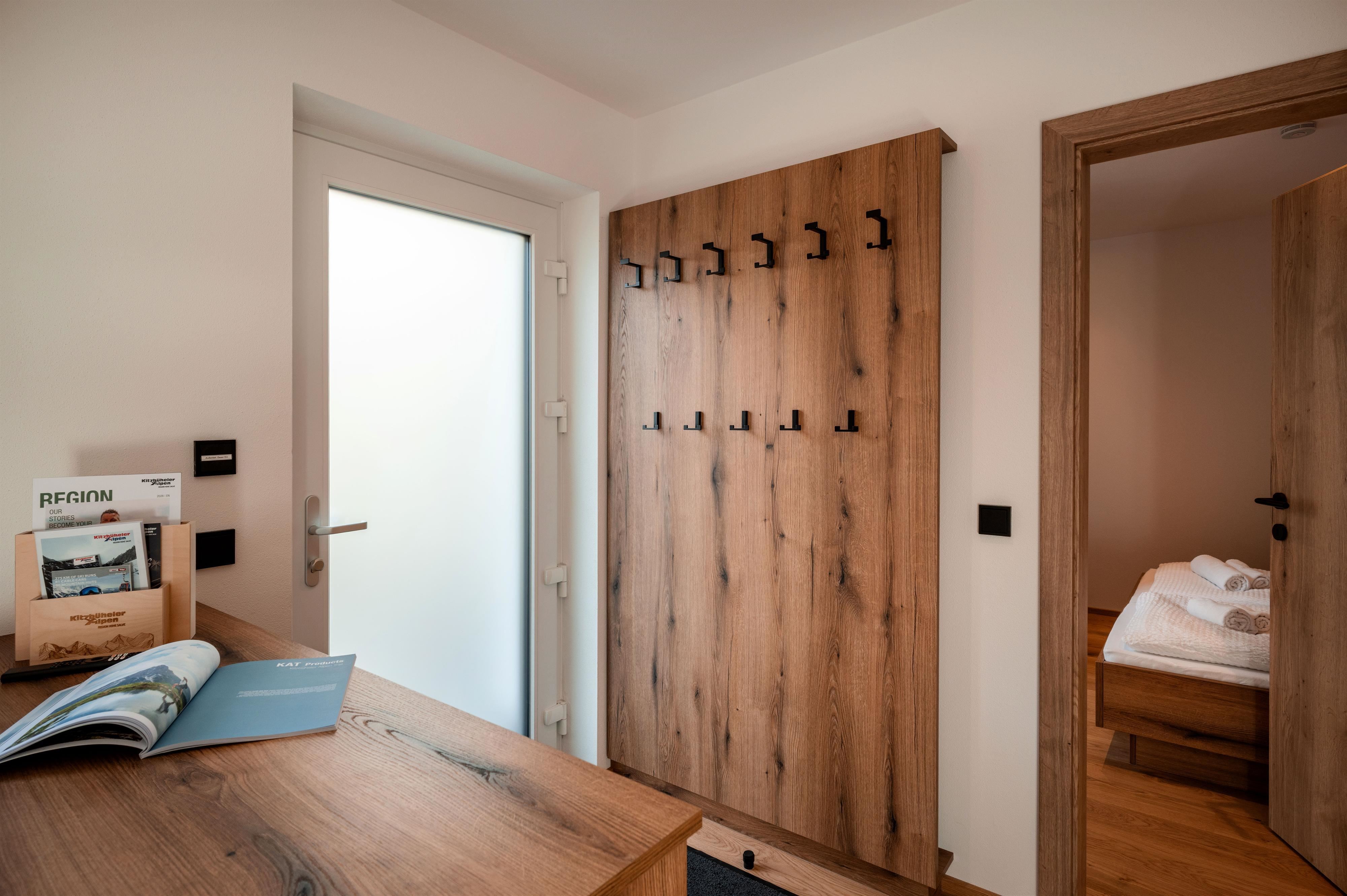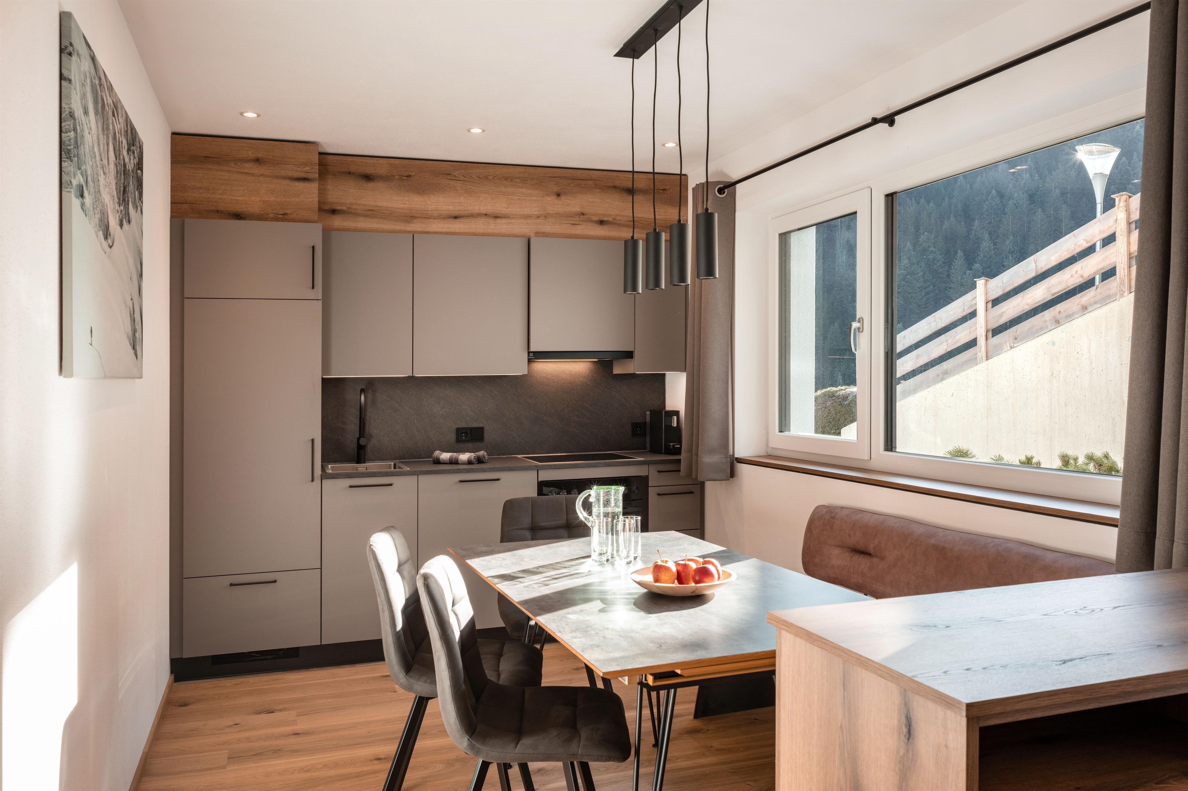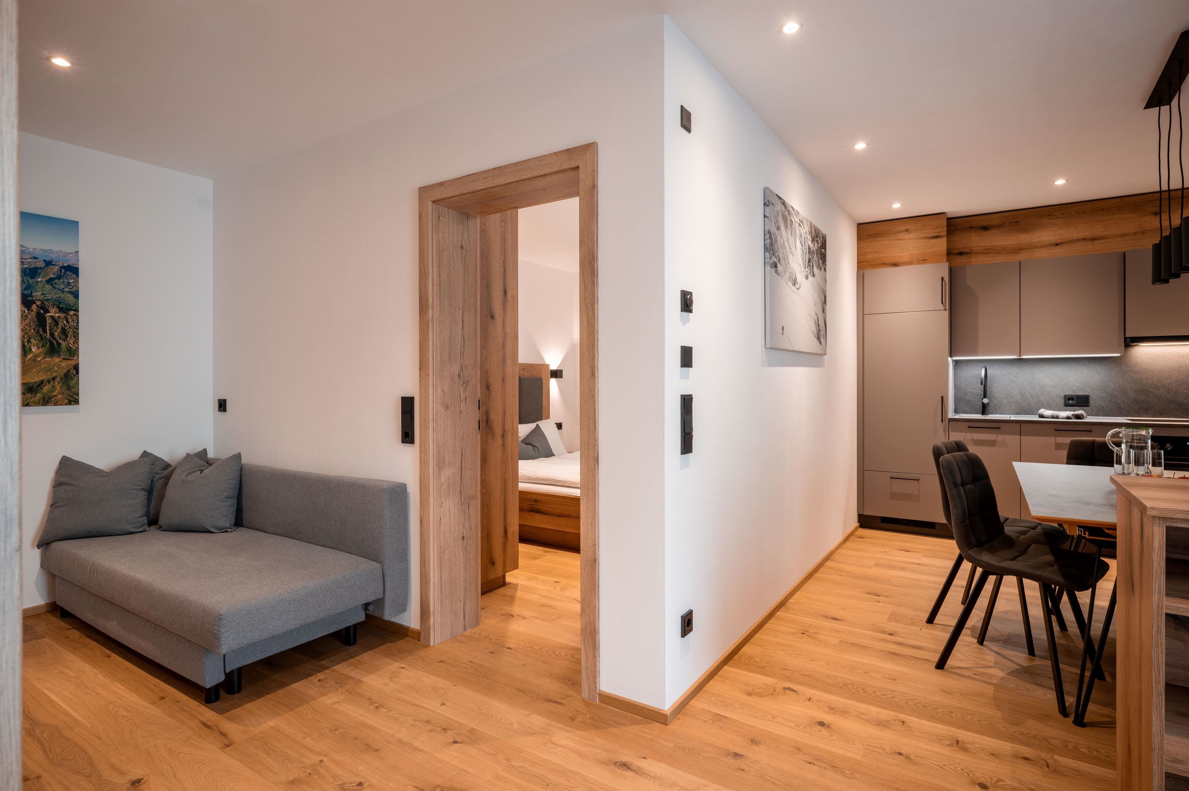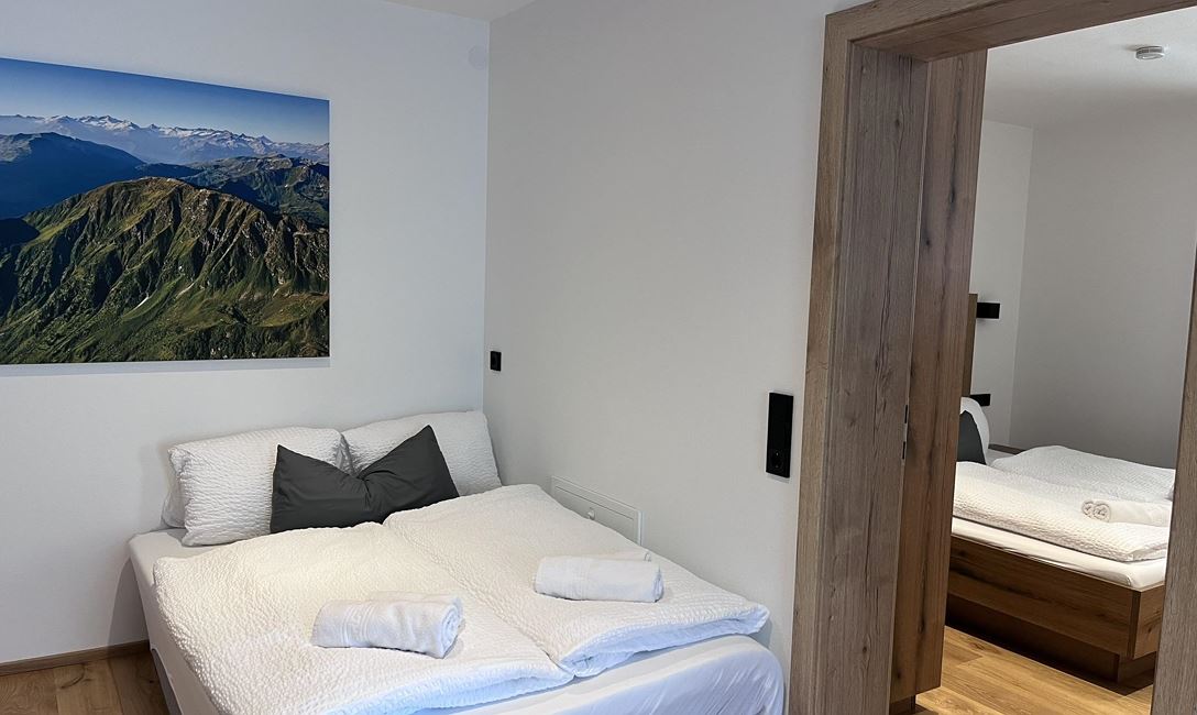 Ferienwohnung (53 m²) mit offener Küche und Wohnbereich, zwei Schlafzimmern, modernem Bad mit Handtuchtrockner und separatem WC. Eigener Eingang, Terrasse sowie separater Abstellraum für Fahrräder und Ski mit Trockner für 5 Paar Schuhe und E-Bike-Ladeanschluss.