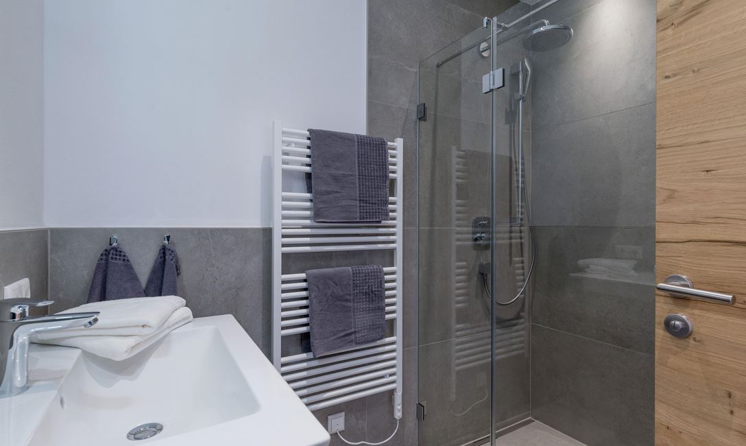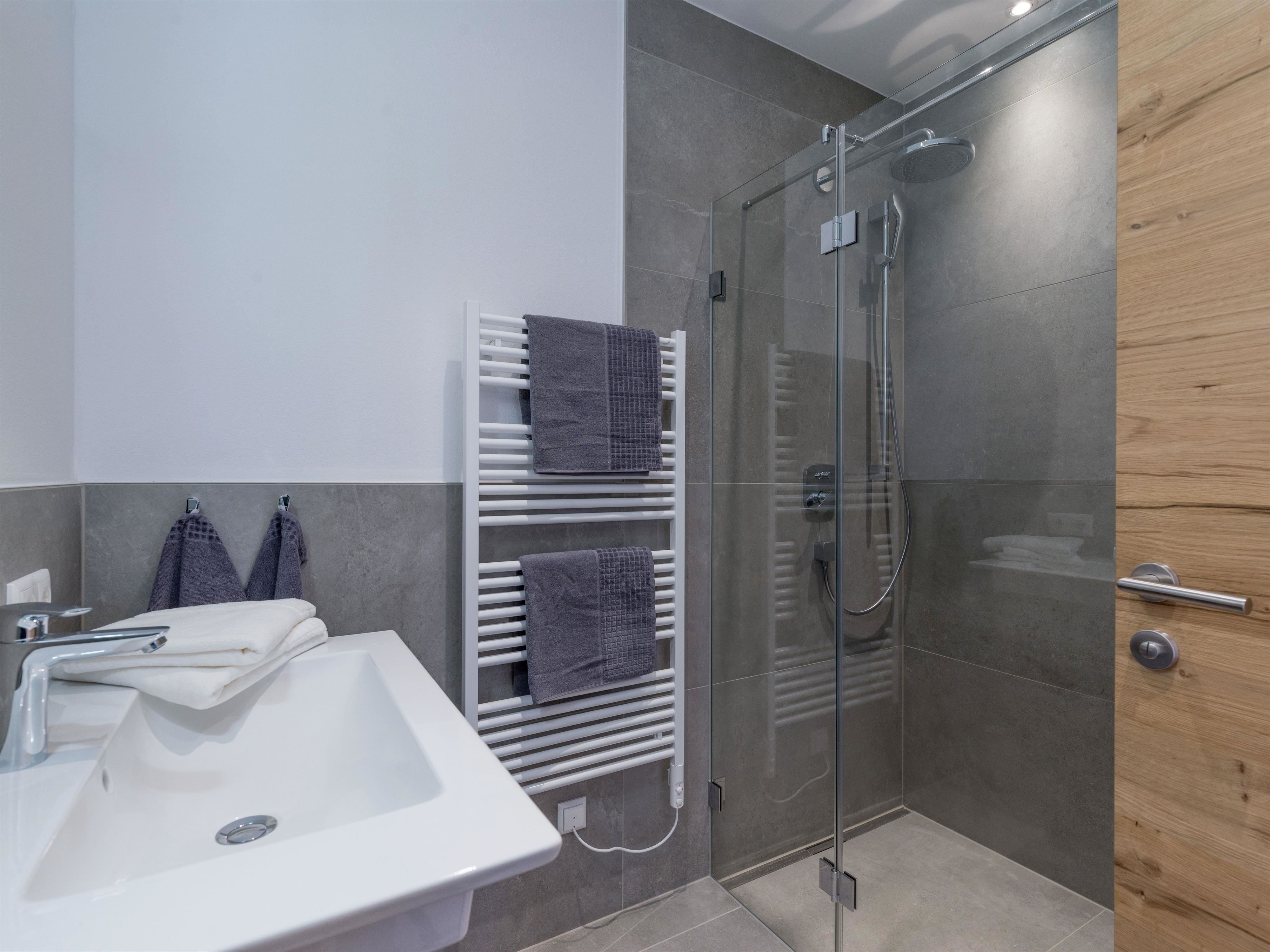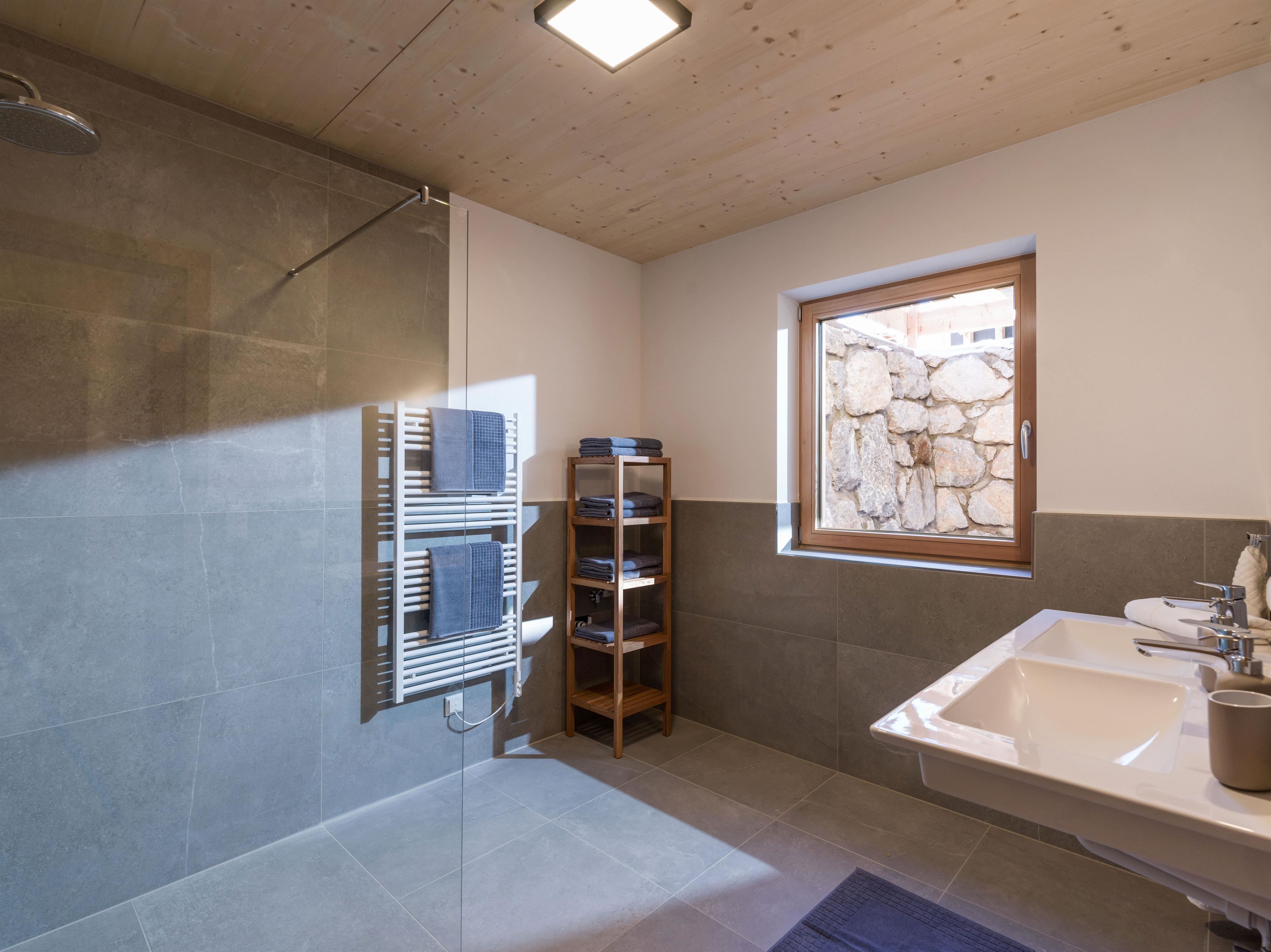 Das Bad ist geräumig und zeichnet sich durch seine begehbare Dusche, ein Doppelwaschbecken und Handtuchtrockner aus. Das WC befindet sich in einem separaten Raum.