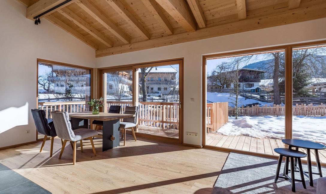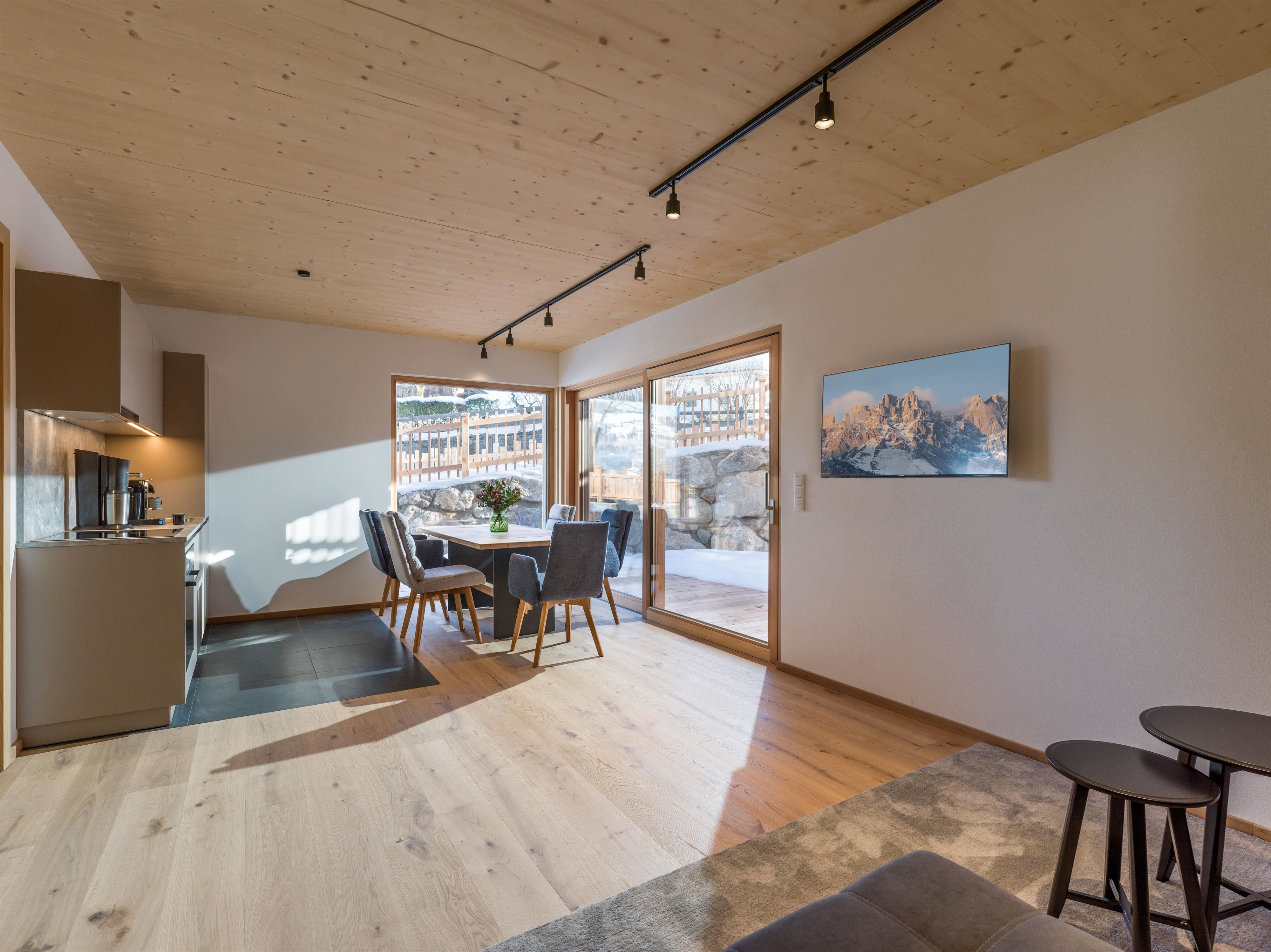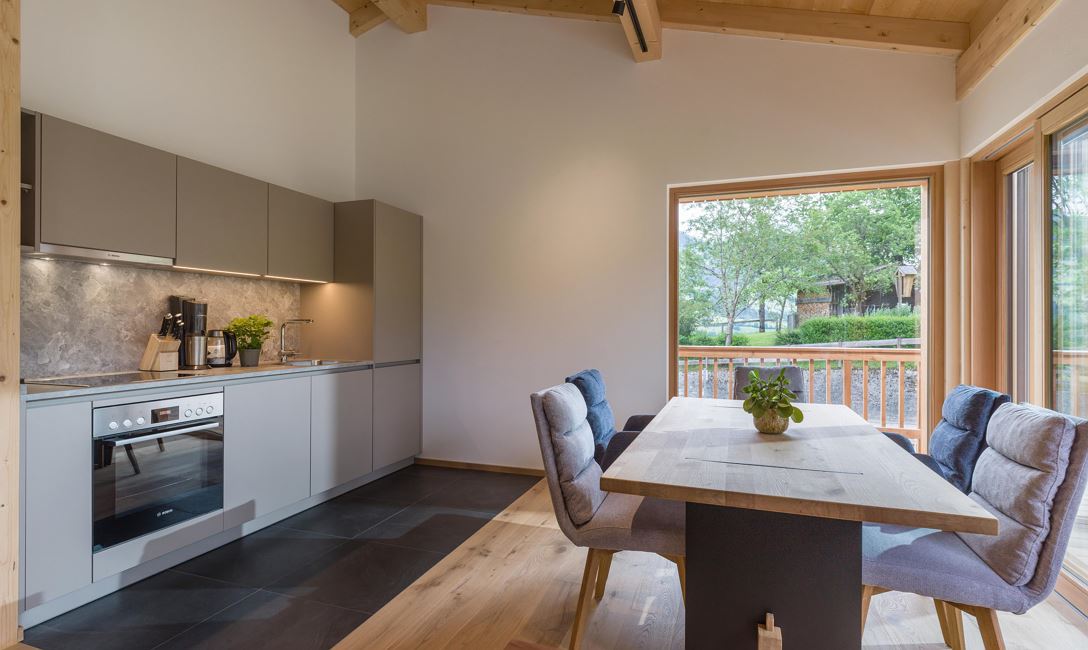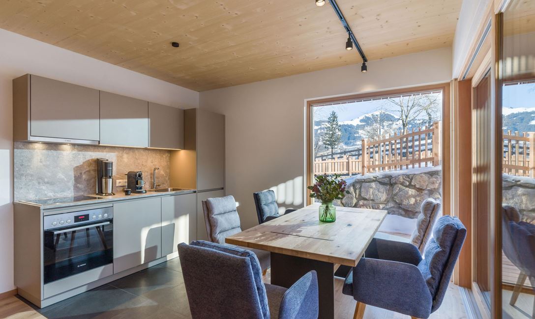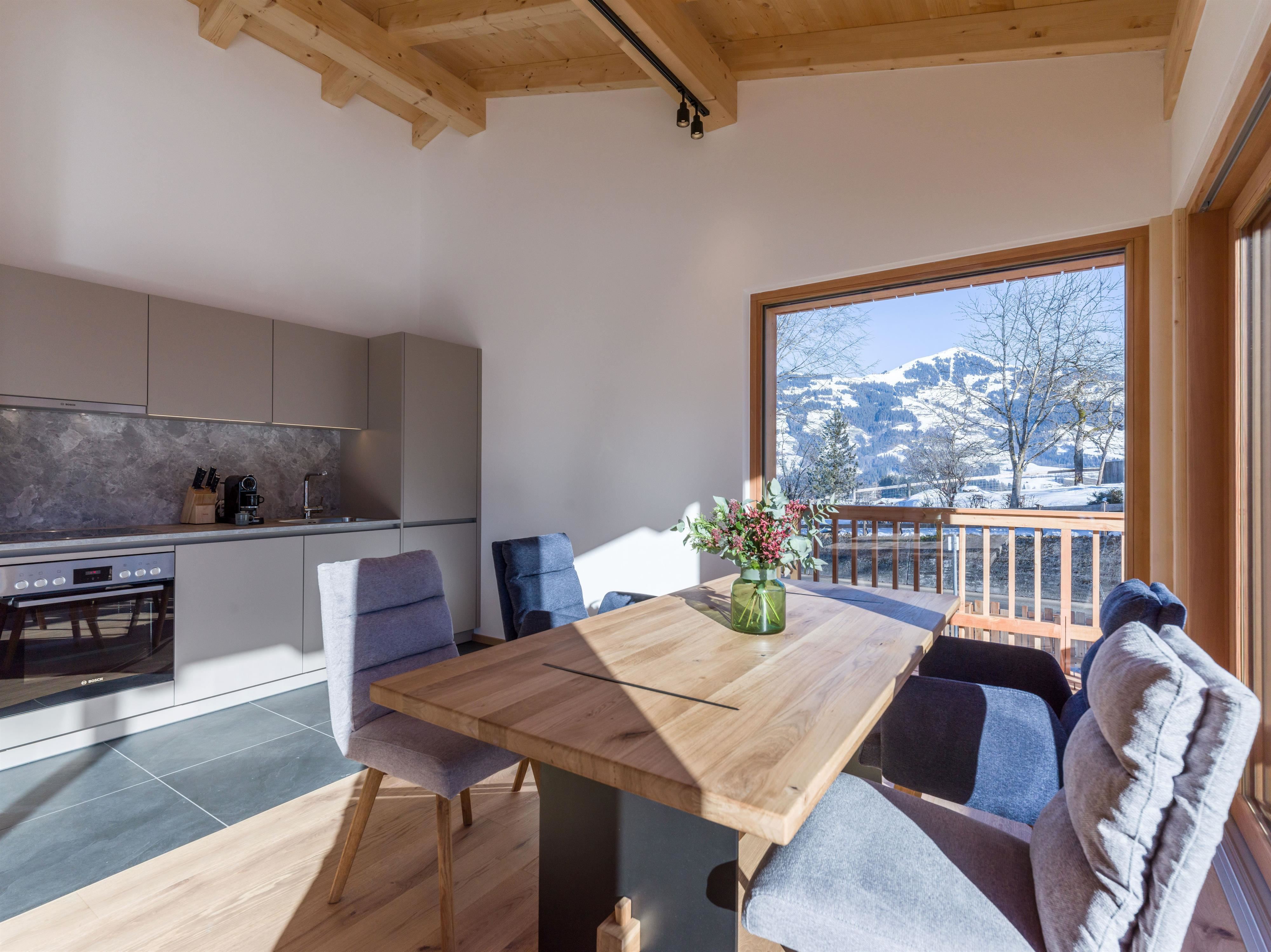 Im Obergeschoß - direkt unter dem Dachgiebel – befindet sich das Apartment Abendrot. Nach dem Eingangsbereich mit Garderobe, einem Bad mit begehbarer Dusche und extra WC, lädt der offene Wohn-Essbereich für bis zu 6 Personen zum gemütlichen Zusammensitzen ein. Vom Esstisch aus geht der Blick unserer Gäste direkt auf unseren Hausberg, die Hohe Salve. Die Küche bietet mit Geschirrspüler, Kühlschrank mit Tiefkühlfach, Herd, Backofen, Kaffeemaschine, Wasserkocher, Geschirr, Gläser, Kochtöpfe, Kochutensilien und Besteck alles, was das Koch-Herz begehrt.