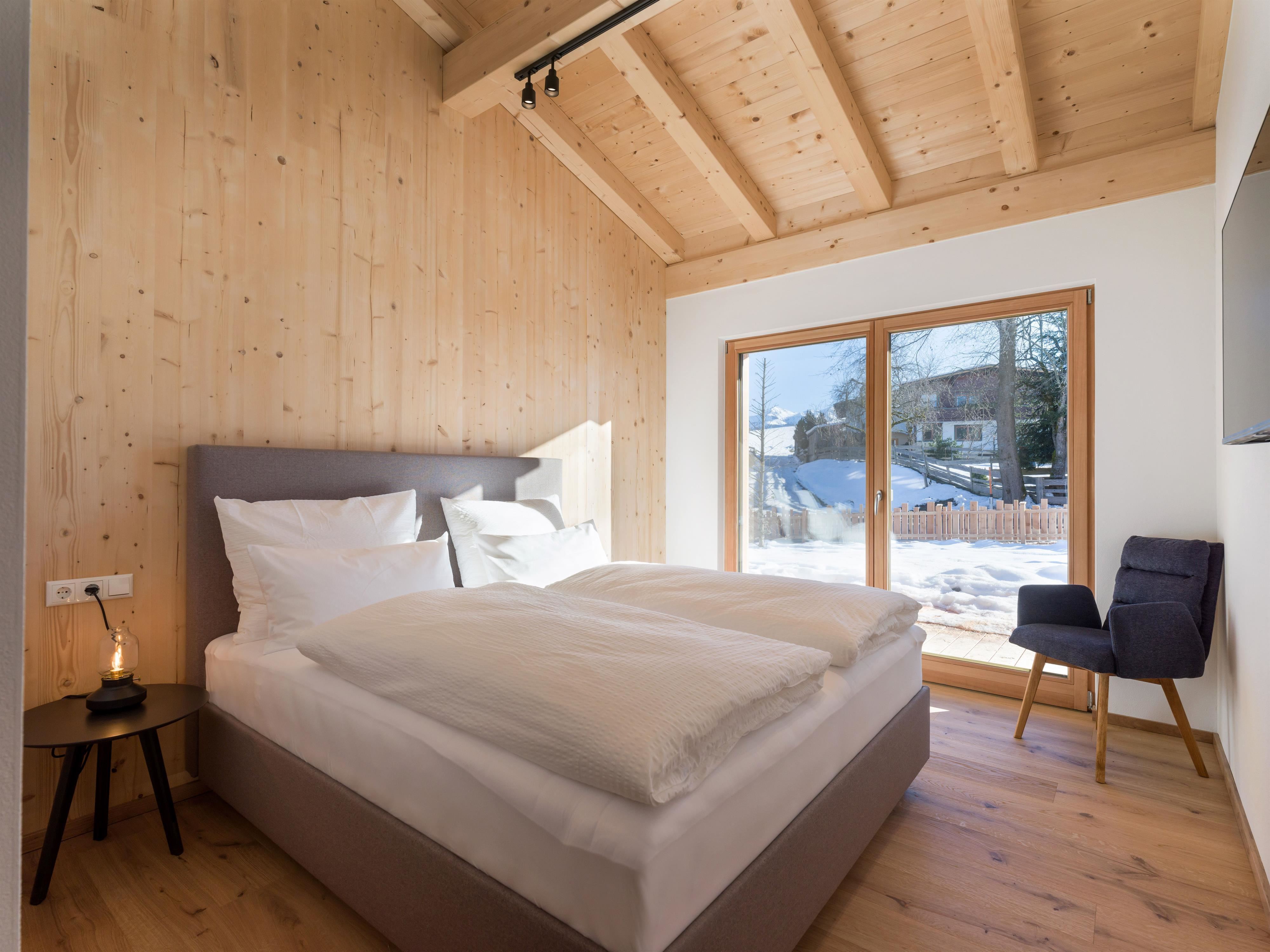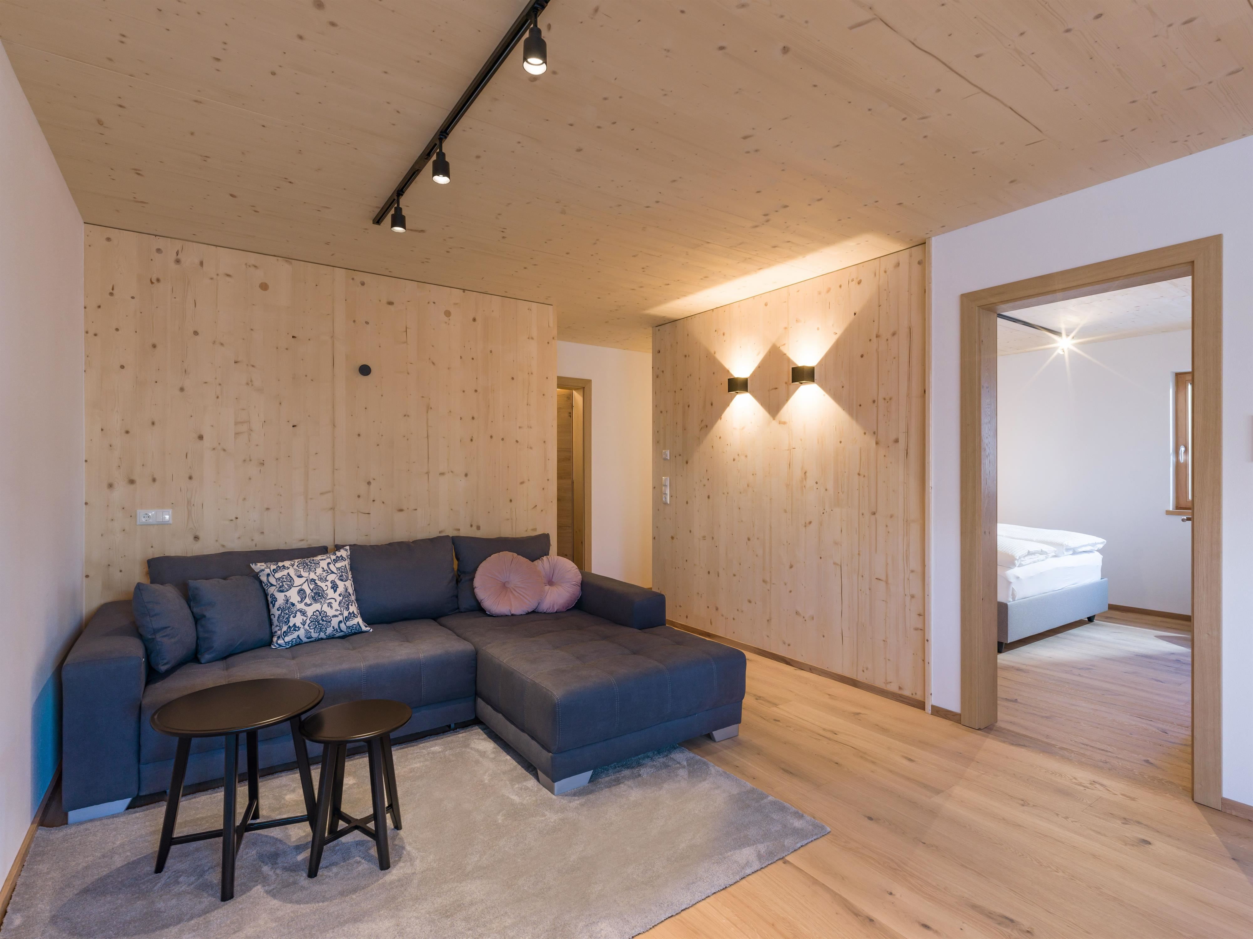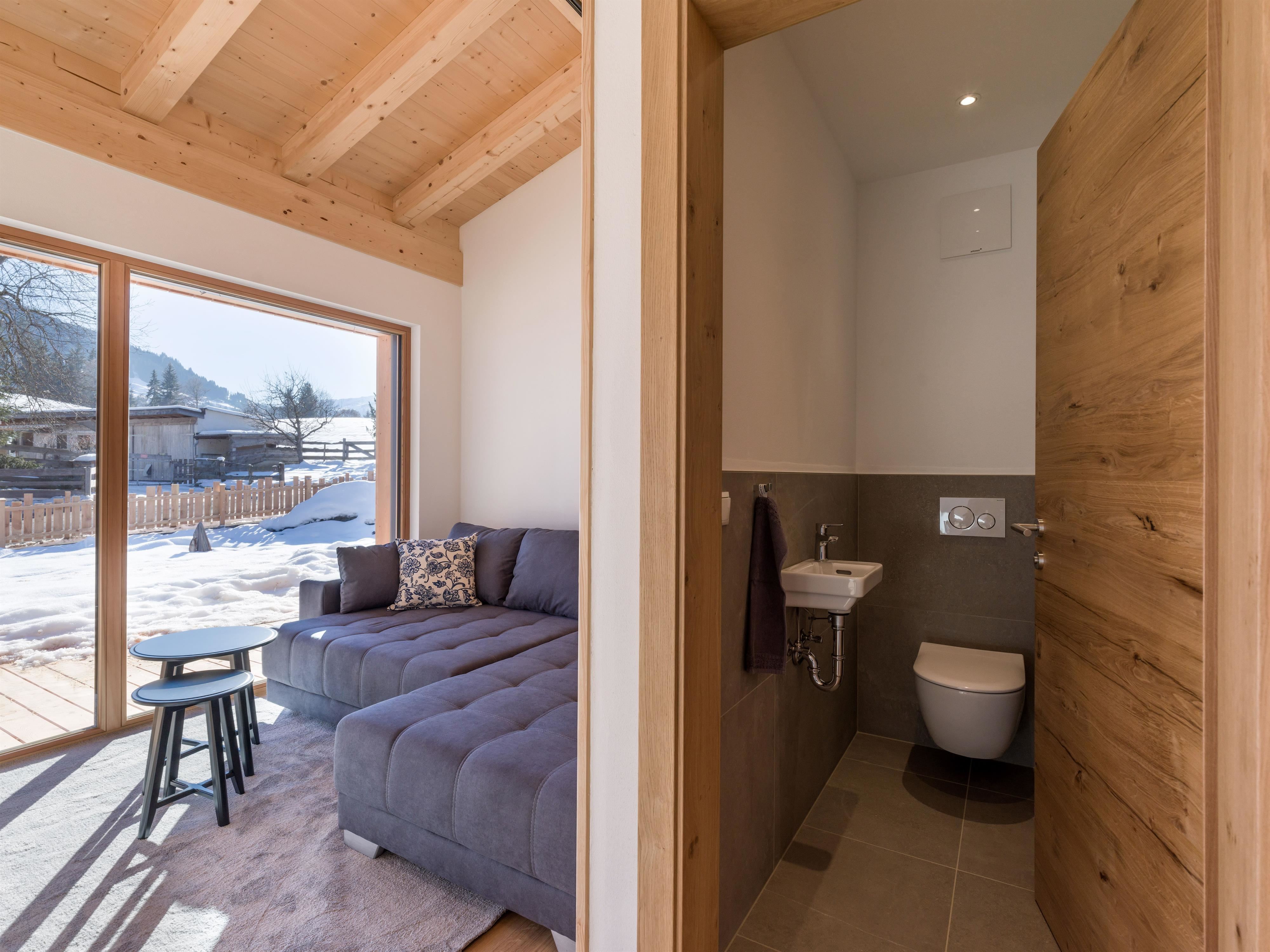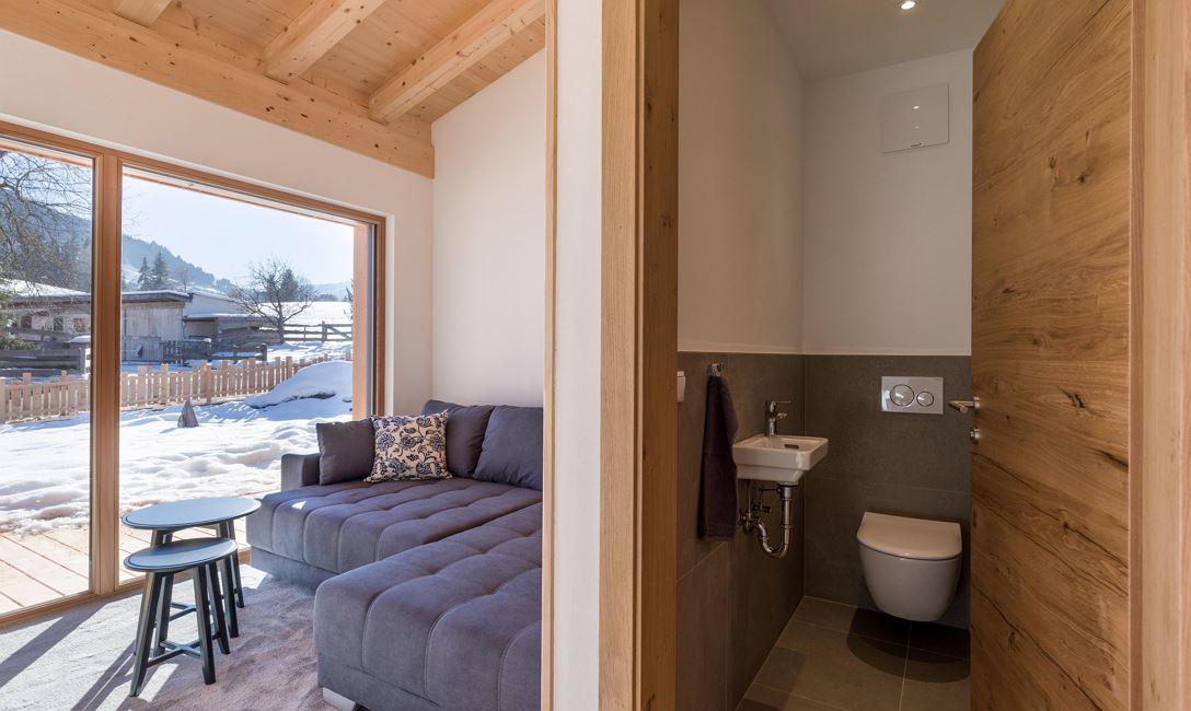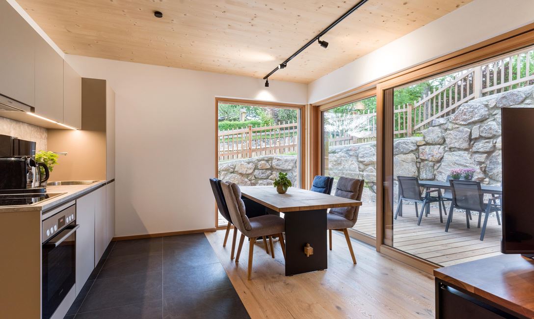 Im Obergeschoß - direkt unter dem Dachgiebel – befindet sich das Apartment Abendrot. Nach dem Eingangsbereich mit Garderobe, einem Bad mit begehbarer Dusche und extra WC, lädt der offene Wohn-Essbereich für bis zu 6 Personen zum gemütlichen Zusammensitzen ein. Vom Esstisch aus geht der Blick unserer Gäste direkt auf unseren Hausberg, die Hohe Salve. Die Küche bietet mit Geschirrspüler, Kühlschrank mit Tiefkühlfach, Herd, Backofen, Kaffeemaschine, Wasserkocher, Geschirr, Gläser, Kochtöpfe, Kochutensilien und Besteck alles, was das Koch-Herz begehrt.