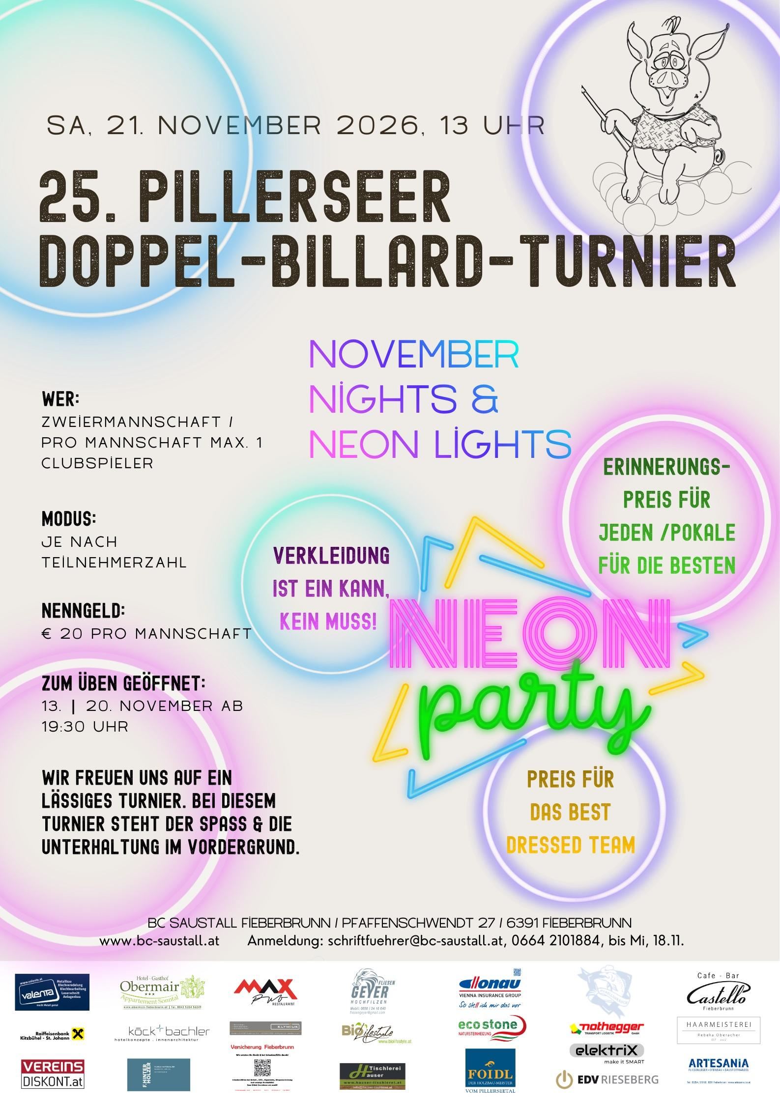 Hobbyturnier - Zweiermannschaften, pro Mannschaft max. 1 Clubspieler. Bei diesem Turnier steht der Spaß und die Unterhaltung im Vordergrund! | Info & Anmeldung: bis Mittwoch, 18.11.2026 unter Tel. +43 664 2101884 oder schriftfuehrer@bc-saustall.at | Kosten: Nenngeld € 20,-/Mannschaft | Treffpunkt: 13 Uhr, Billiardclub Saustall, Pfaffenschwendt 27, 6391 Fieberbrunn | Sonstiges: Motto: November Nights & Neon Lights. Verkleidung ist willkommen, aber kein Muss. Erinnerungspreis für alle Teilnehmer / Pokale für die Besten. Sonderpreis für das best dressed Team. Trainingsmöglichkeiten: 13. und 20. November ab 19:30 Uhr
