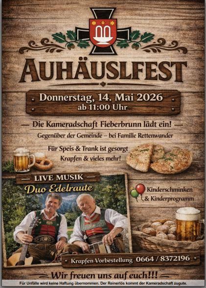Die Kameradschaft Fieberbrunn lädt zu einem genuss- und stimmungsvollen Feiertag mit bester Unterhaltung durch das Duo Edelraute ein! Außerdem dürfen sich kleine Gäste auf ein Kinderprogramm mit Kinderschminken freuen | Treffpunkt: Auhäusl Fieberbrunn, Spielbergstr. 23, 6391 Fieberbrunn | Sonstiges: Krapfen Vorbestellung unter +43 664 8372196 |