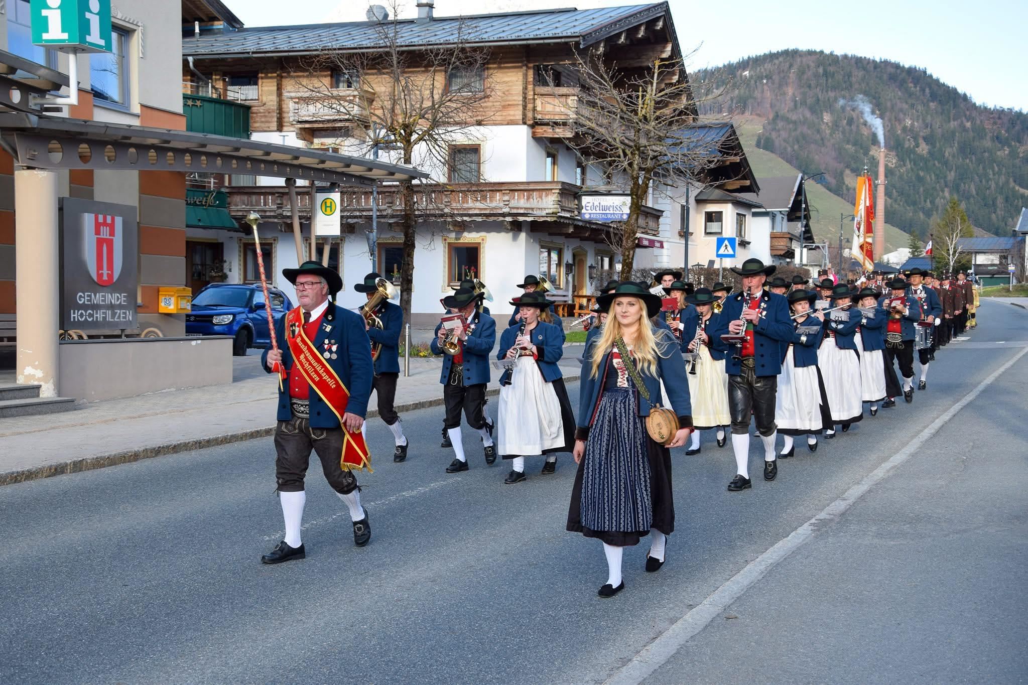 Tiroler Kultur hautnah zu spüren: das traditionelle Maiblasen von der Bundesmusikkapelle Hochfilzen lädt Einheimische und Gäste gleichermaßen ein, um den authentischen Melodien zu lauschen und die Musikantinnen und Musikanten in ihren prächtigen Trachten zu sehen. Start: südlich der Bahn