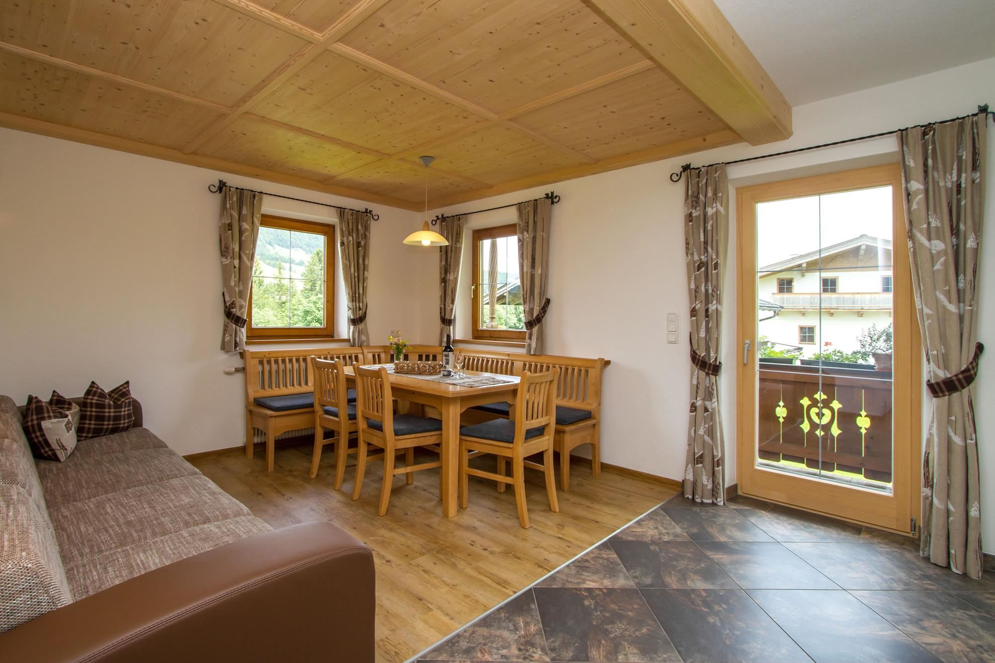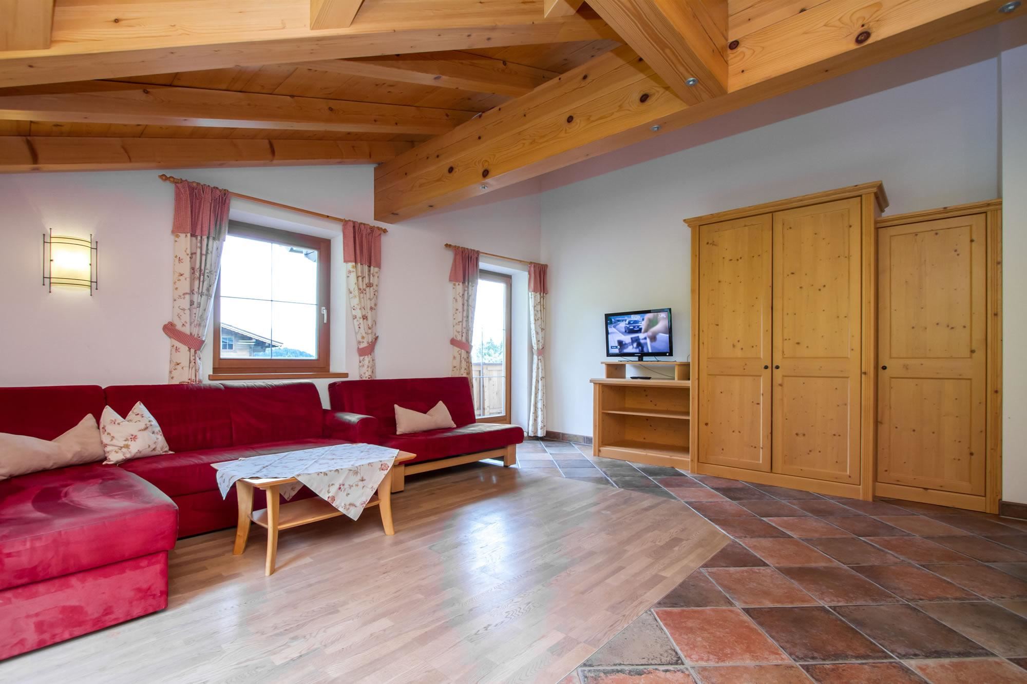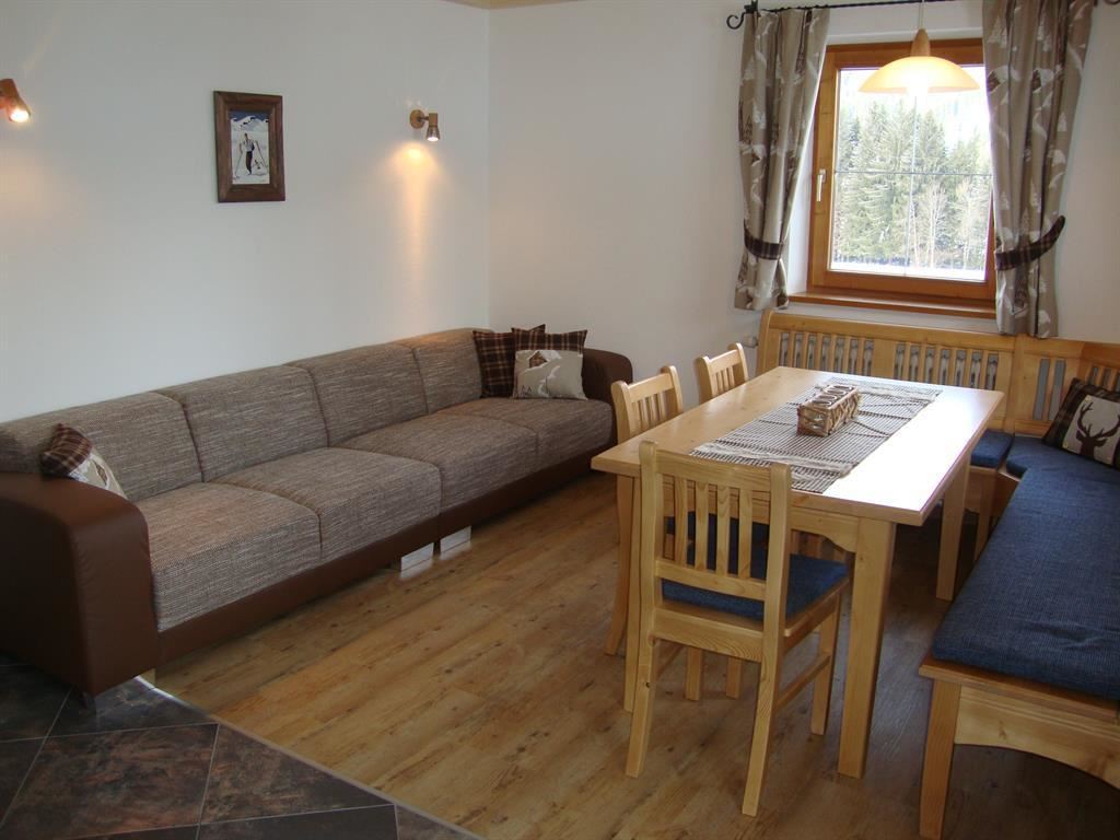 Sehr großzügige gemütliche Ferienwohnung mit 2 separaten Schlafzimmern mit Doppelbett für bis zu 6 Personen, großes Wohnschlafzimmer mit Doppel-Schlafsofa, großer Couch und offener Küche mit Geschirrspüler, Badezimmer mit Doppelwaschbecken und Dusche, WC extra, Sichtdachstuhl, 2 Balkone, TV, Radio, großzügige Garderobe, Skischuhtrockner, 1 Zusatzbett gegen Aufpreis möglich; 80 m² Wohnfläche.