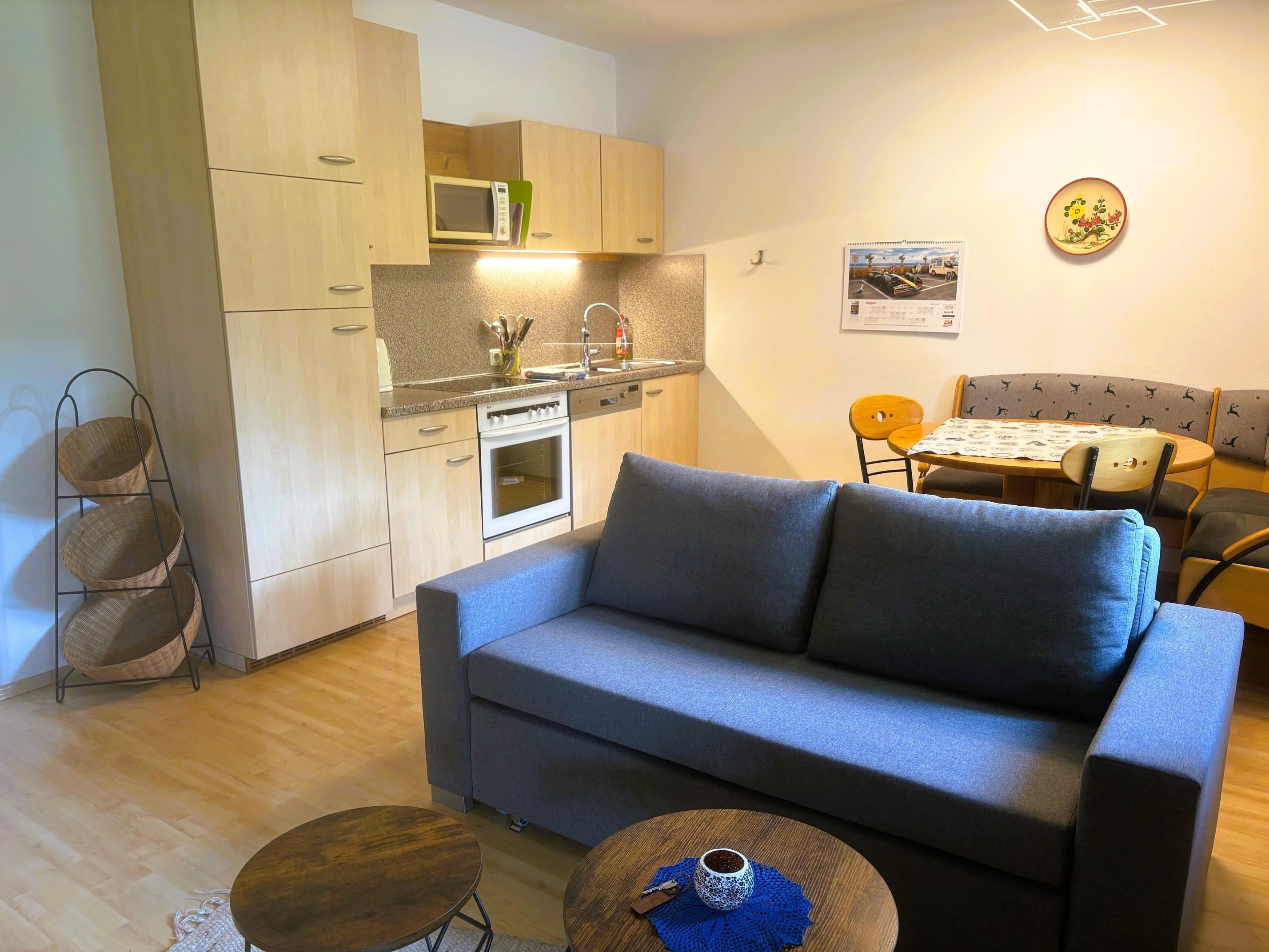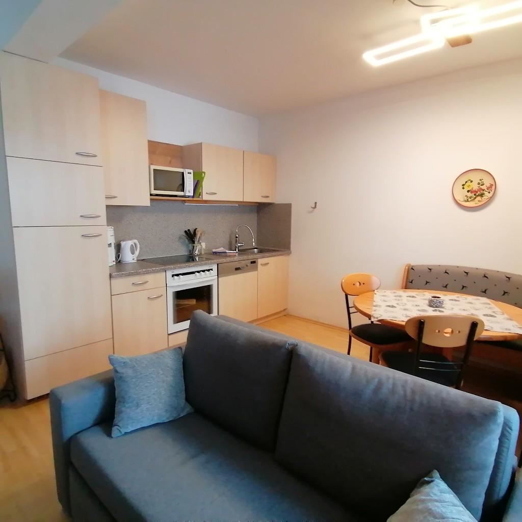 Gemütlich eingerichtete Wohnung (südseitig) mit: Vorraum, Bad/WC, großes Wohnzimmer mit Kochnische und Doppelausziehcouch,Schlafzimmer mit Doppelbett, Balkon im 2. Stock, Terrasse im Parterre, ca. 55 m². Alle FeWo-s sind mit Geschirrspülmaschine, Backofen, Kabel-TV, Radio, W-Lan, Bettwäsche, Handtücher, Haarfön ausgestattet!