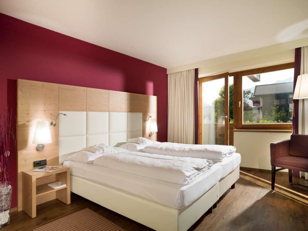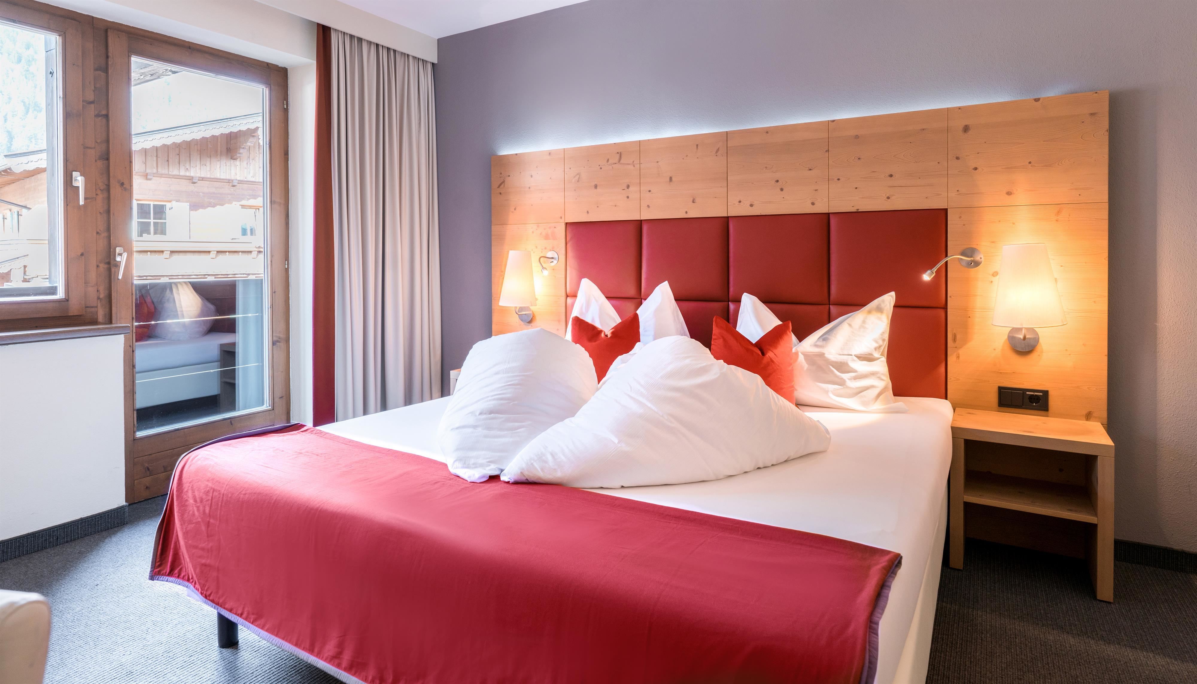 Renoviertes Doppelzimmer in modernem Tiroler Stil mit natürlichen Materialien und kräftigen Farben. Die Zimmer verfügen über Bad mit Badewanne/Dusche sowie Balkon, teilweise Twin-Betten. - Bietet Platz für 2 Personen auf 26 m²