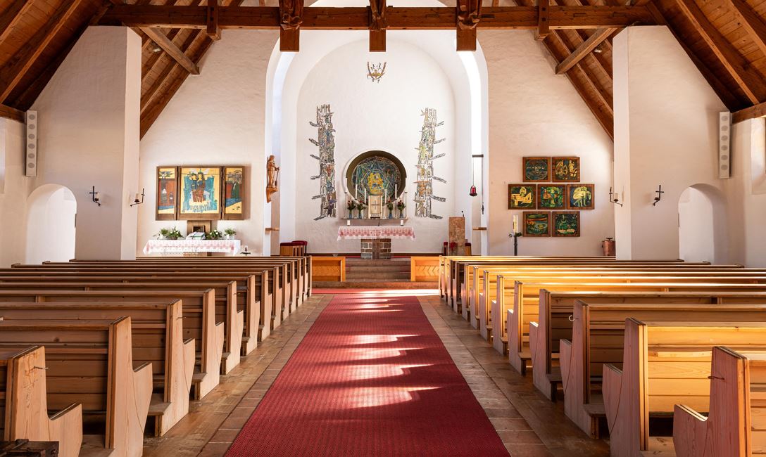 Das Innere des großen Saales dominiert die Kreuzgruppe am Chorbogen, die 1957 Sepp Baumgartner aus Schwaz schnitzte. Im gleichen Jahr schuf Richard Kurt Fischer aus Innsbruck das Apsismosaik zum Thema des apokalyptischen Lammes und des himmlischen Jerusalem. 1975 folgte das Mosaik der Kirchenpatronin auf der Rückwand.