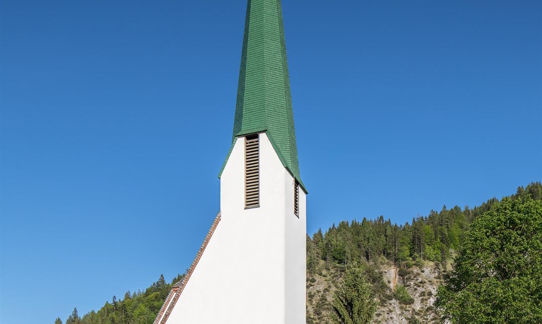 Der einschiffige Bau mit dem tief herabgezogenen Dach und dem chorständigen Turm fügt sich harmonisch in die Landschaft ein.
