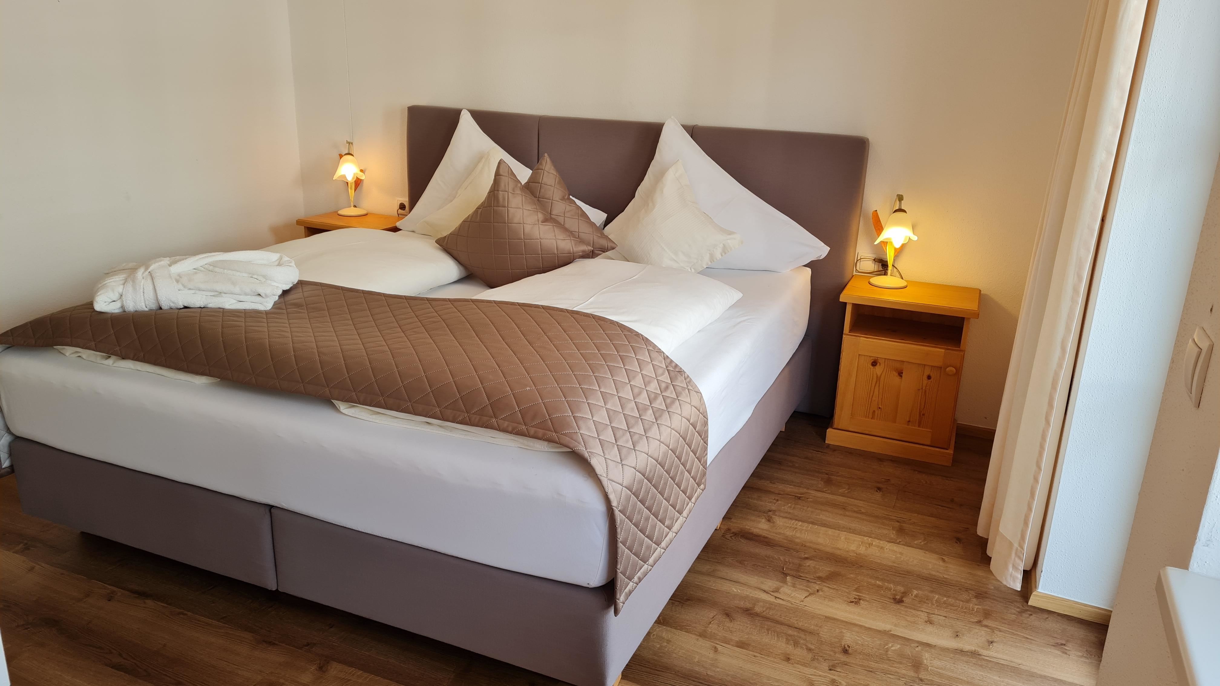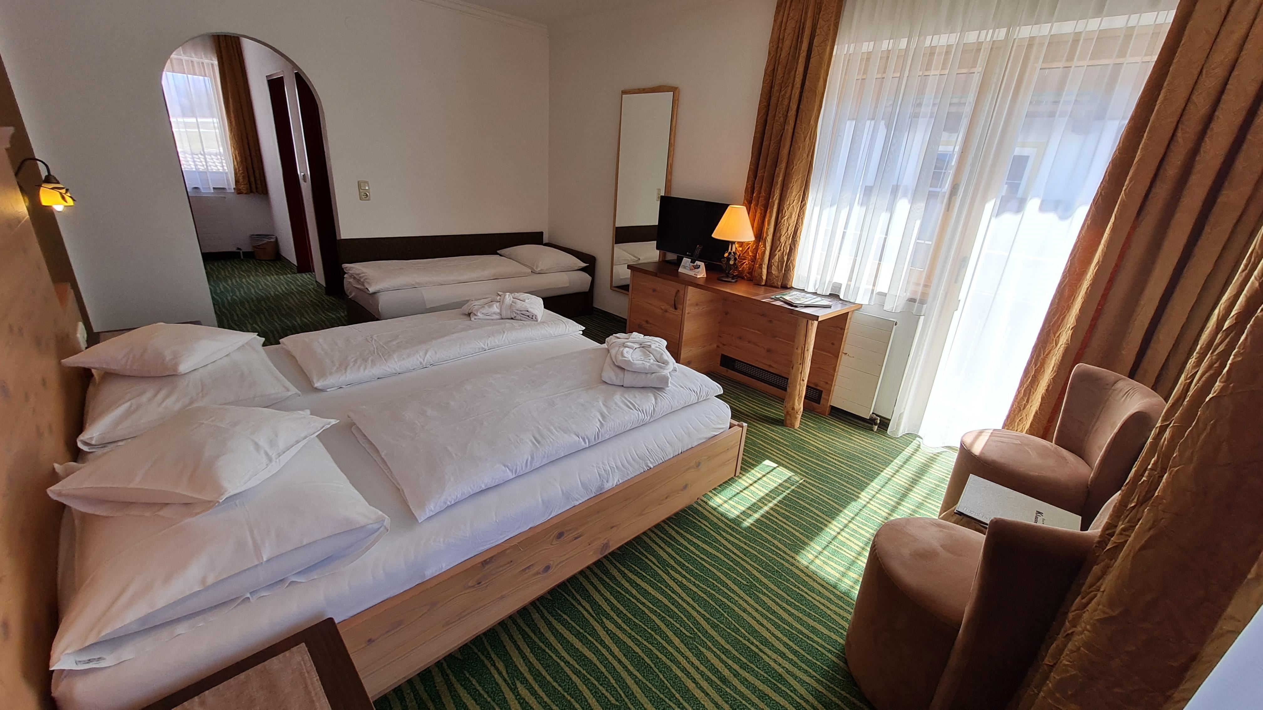 Our category K rooms, 25m², are furnished with country-style furniture and of course with shower/WC, telephone, radio, cable TV, free WiFi connection for your Notebook, safe and balcony.