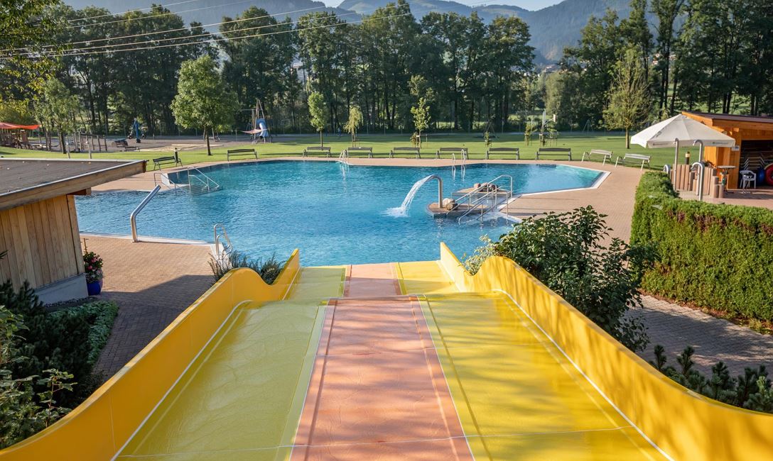 With a wide slide, children's pool, playground, and spacious sunbathing area.