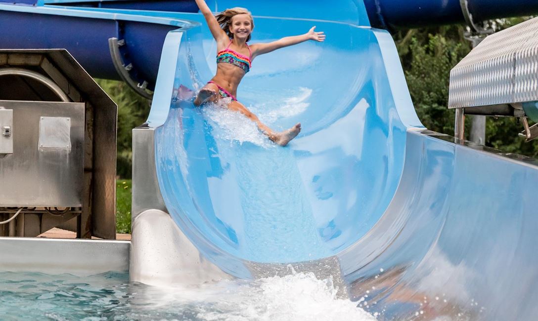 Equipped with a whirlpool, three large water slides, and an outdoor lazy river.