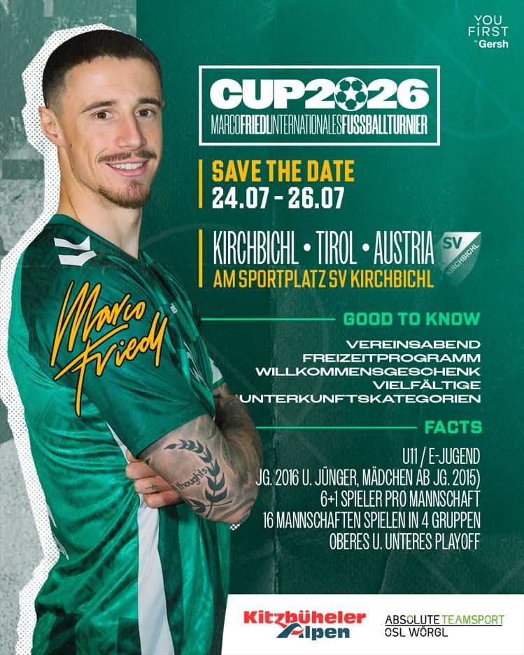 Join us from July 24 to 26, 2026, in Kirchbichl, Tyrol, for the Marco Friedl Cup. An international football highlight amidst the impressive Tyrolean mountains. In this tournament, 16 international teams will compete against each other on excellently maintained grass and artificial turf pitches.