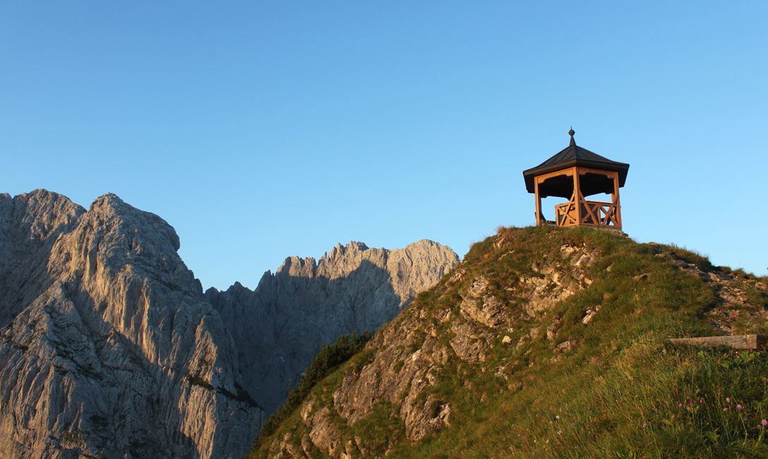After the Griesner Alm car park, a wooden footbridge leads over the Kaisertalbach stream. Through sparse deciduous forests and across wide alpine pastures, always below the imposing cliffs of the Wilder Kaiser, you hike up to the Stripsenjochhaus (1577 m). Soon after the Tavonaro cross, the route follows a short, rope-secured path along a rock face.On this part of the hike, you now climb the Stripsenkopf (1807 m) on a black mountain trail. From the viewing pavilion, there are phenomenal views of the Wilder Kaiser, from the Karlspitze to the Totenkirchl, and as far as Lake Chiemsee in Bavaria. This pavilion was built in 1924 by the Alpine Club section Neuötting (Bavaria). However, the windbreak pavilion was destroyed in the 60s by a lightning strike. On the occasion of the 100th anniversary of the Stripsenjochhaus, the pavilion was rebuilt in 2002. In our region, the Stripsenkopf is one of the most popular lookout mountains. Returne on the same track.