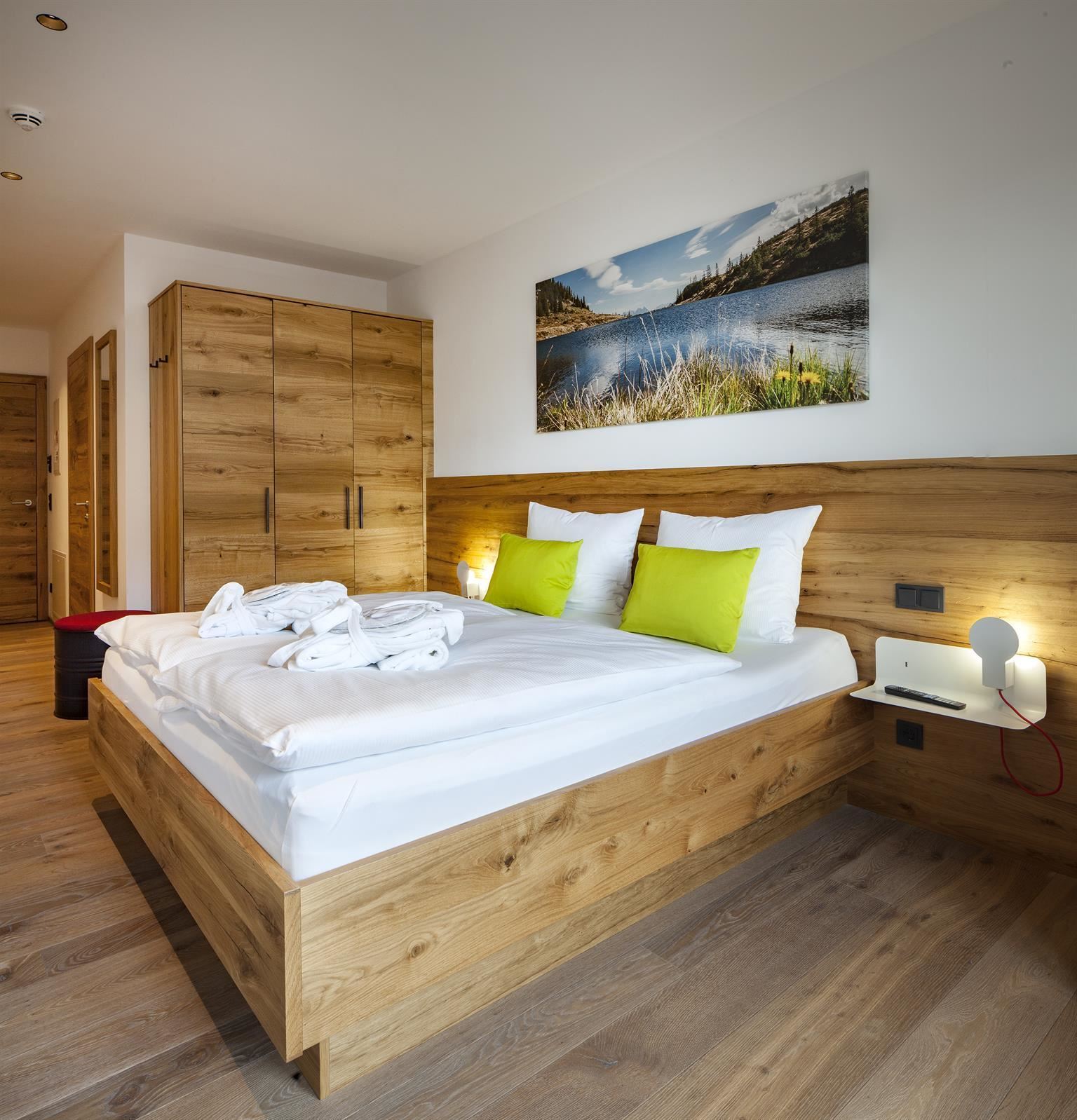 Twee-persoonskamer in high-end basic design met natuurlijke, lichte materialen, alpiene flair en echte gezelligheid. Gratis highspeed wifi, eigen ski- en bikeberging in de kelder, privé parkeergarageplaats naar beschikbaarheid. Indien gewenst ontbijtservice.