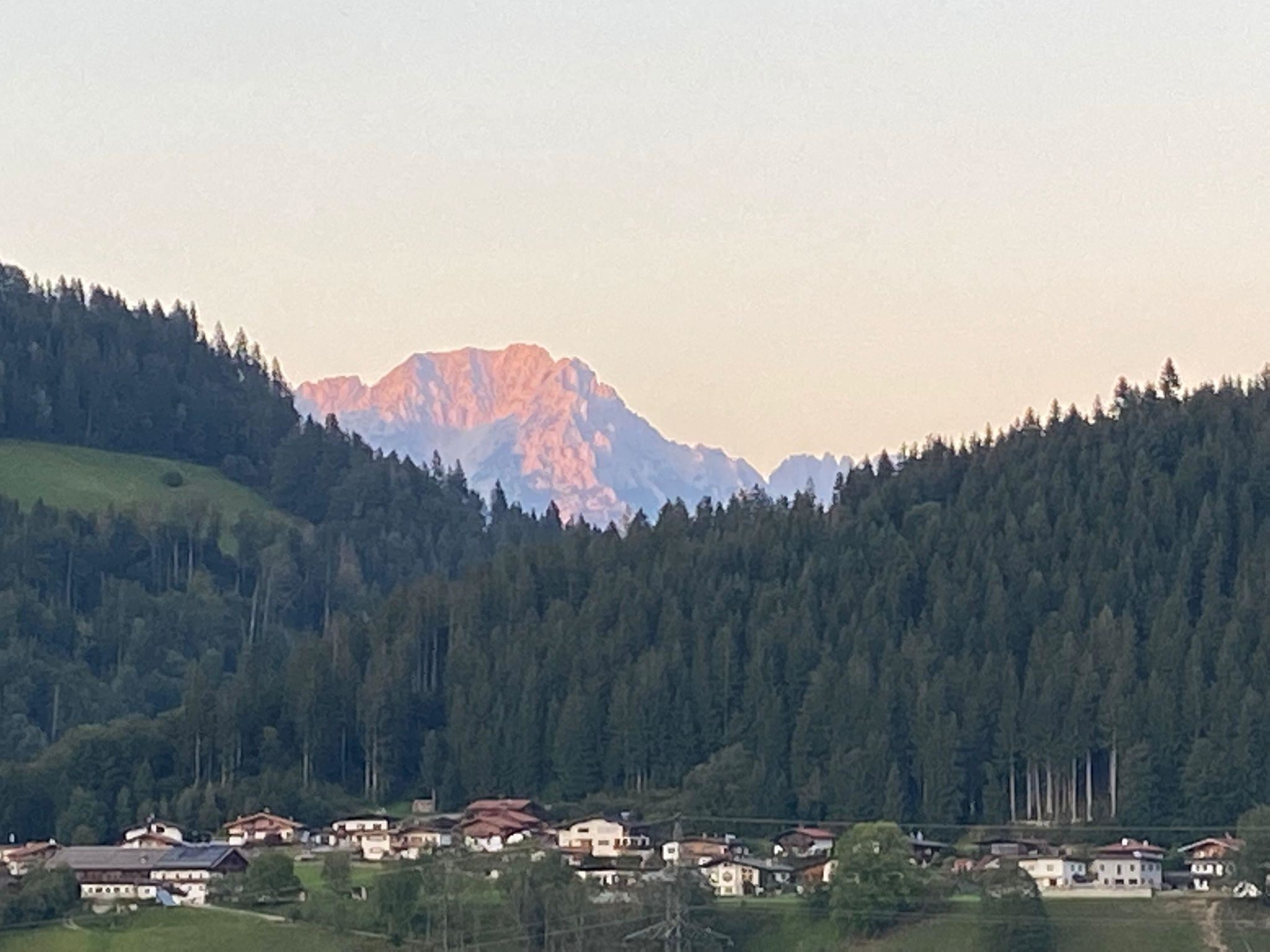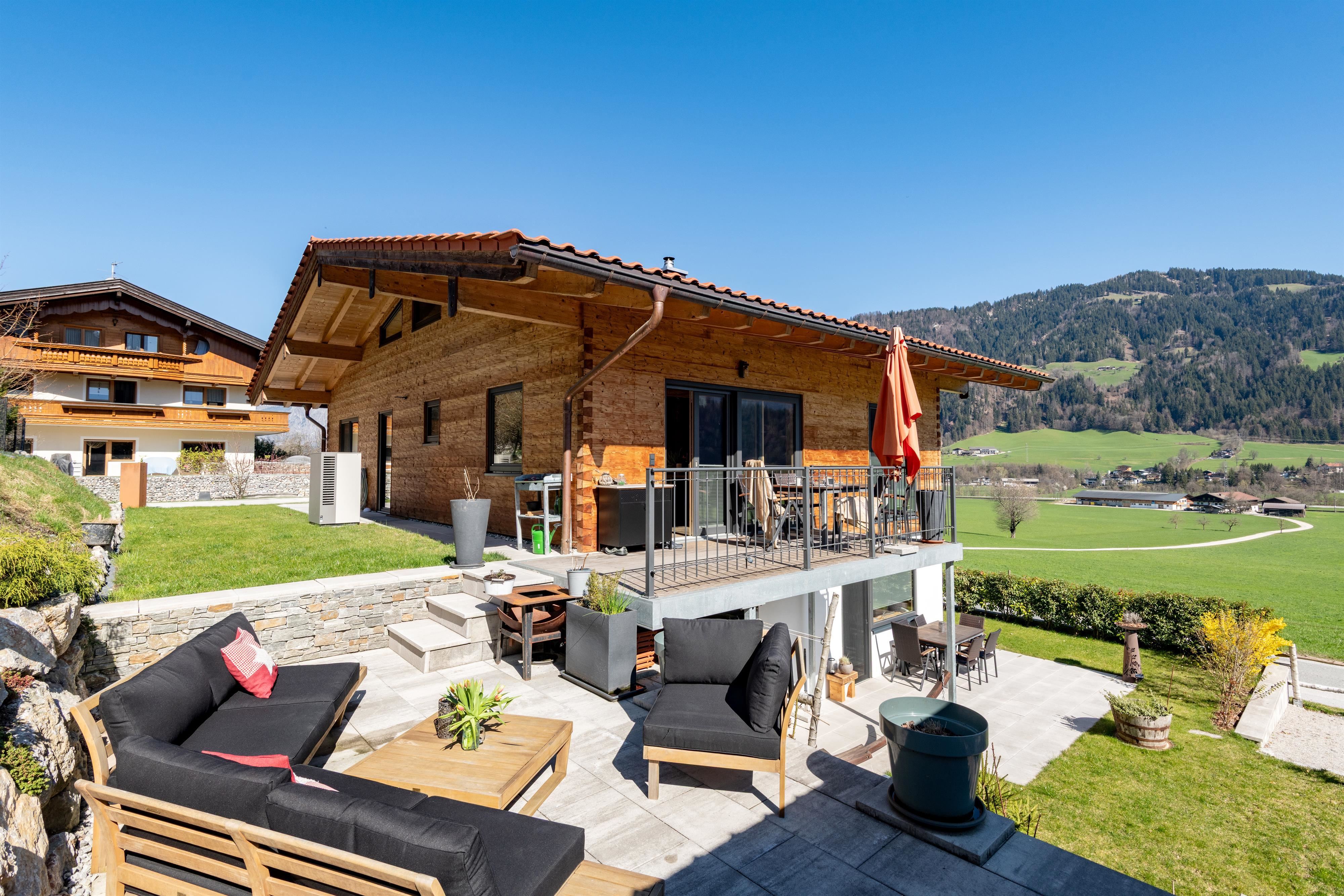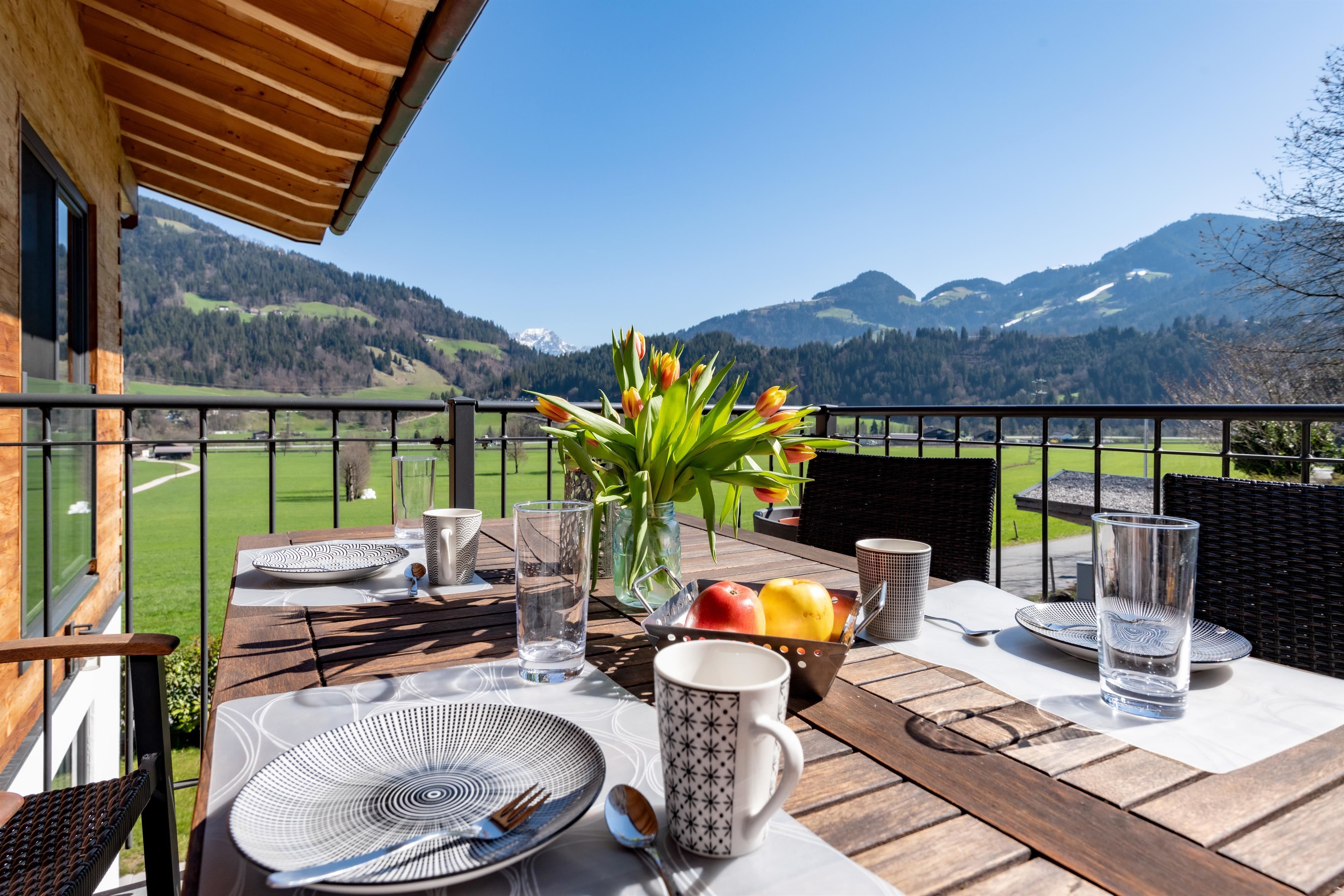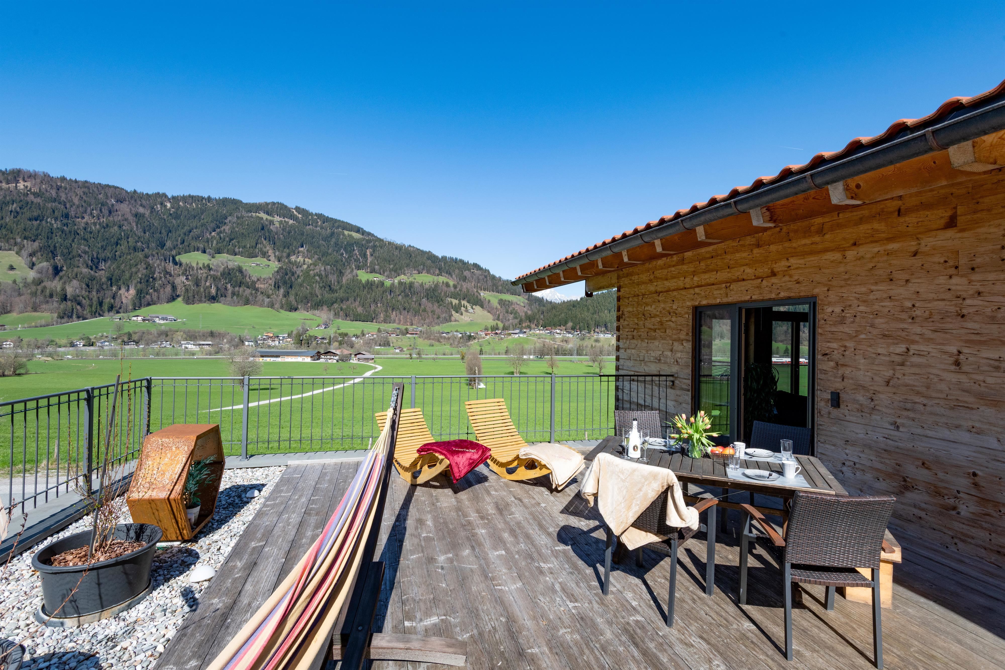 Het terras dat is uitgerust met een tafel, stoelen, parasol en hangmat, nodigt niet alleen uit tot ontspanning in de buitenlucht, maar biedt ook een prachtig uitzicht op de Wilde Kaiser, waardoor je de neiging krijgt om nog een paar extra foto's te maken.