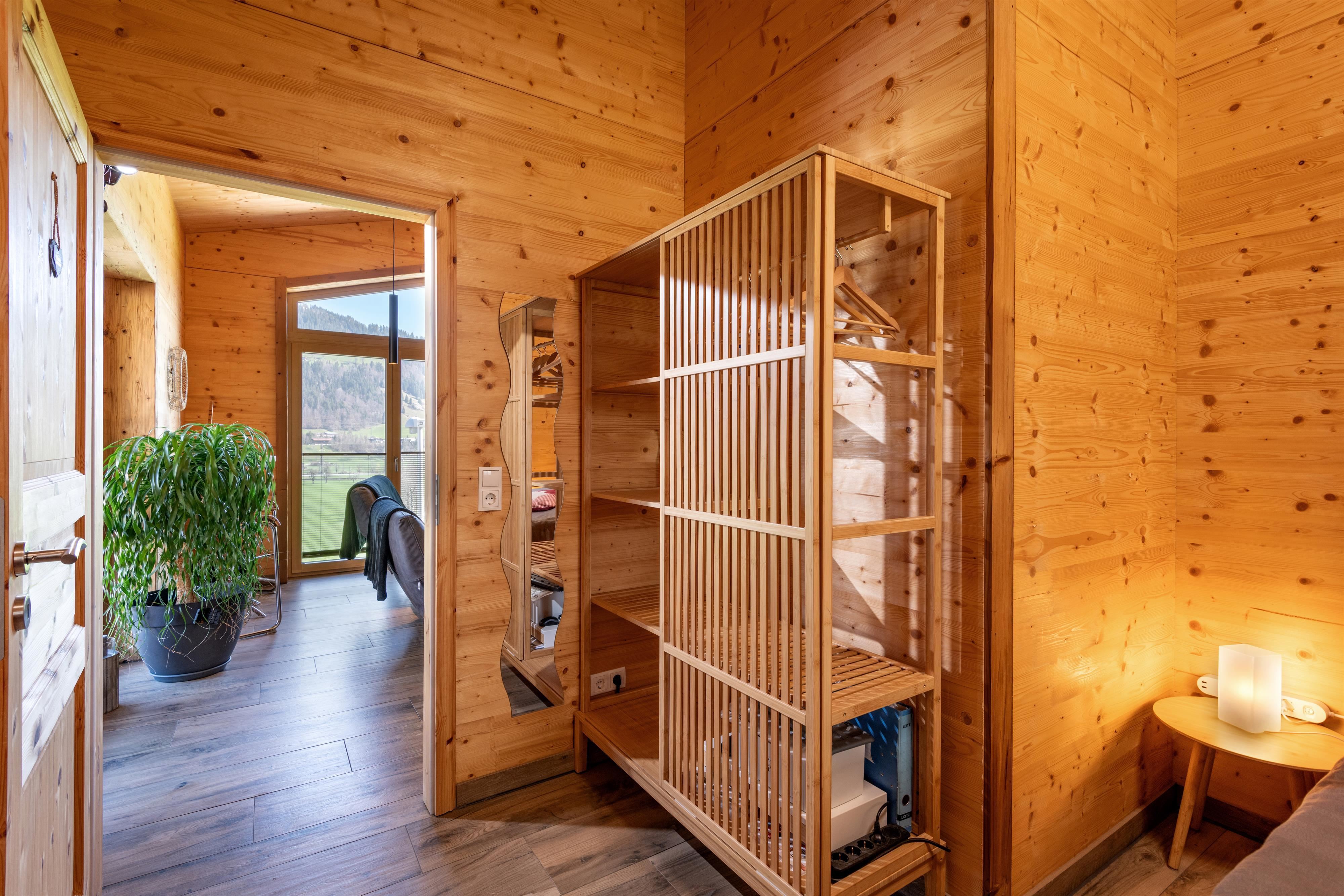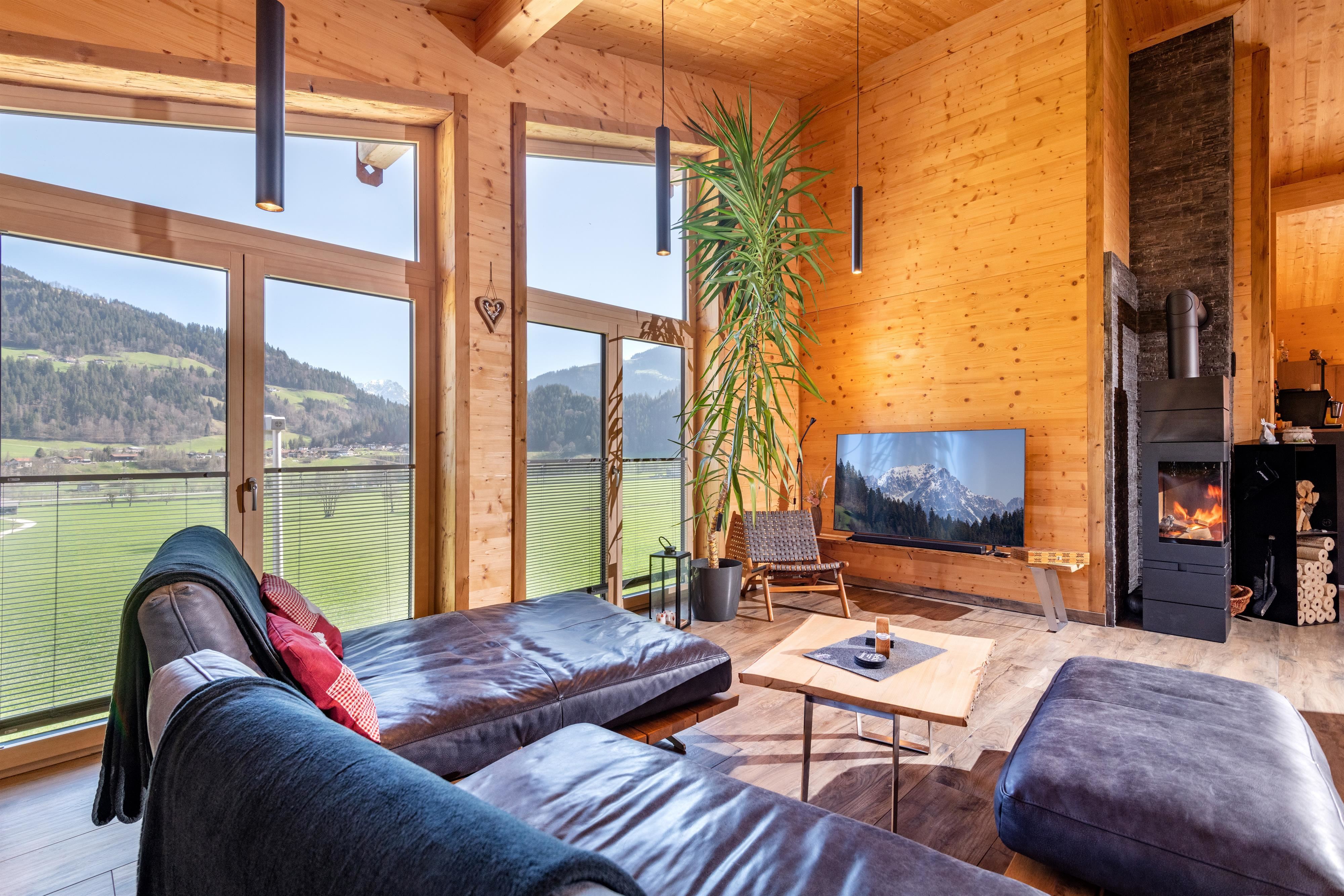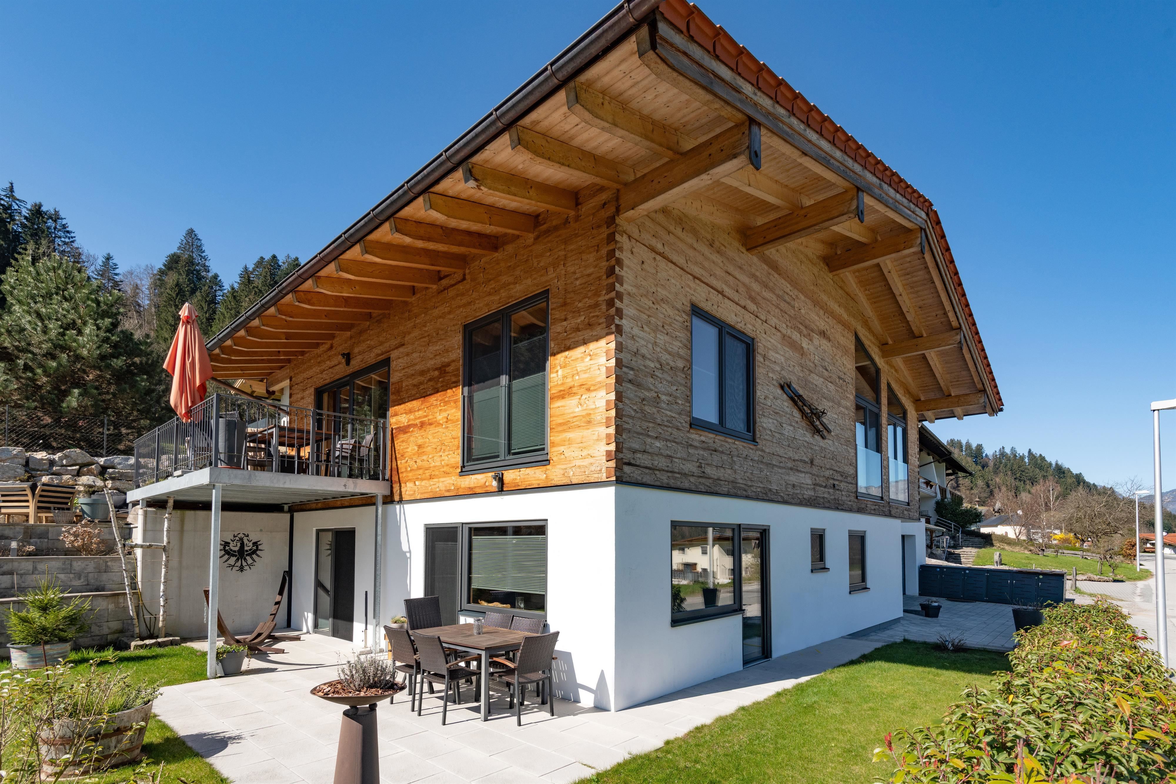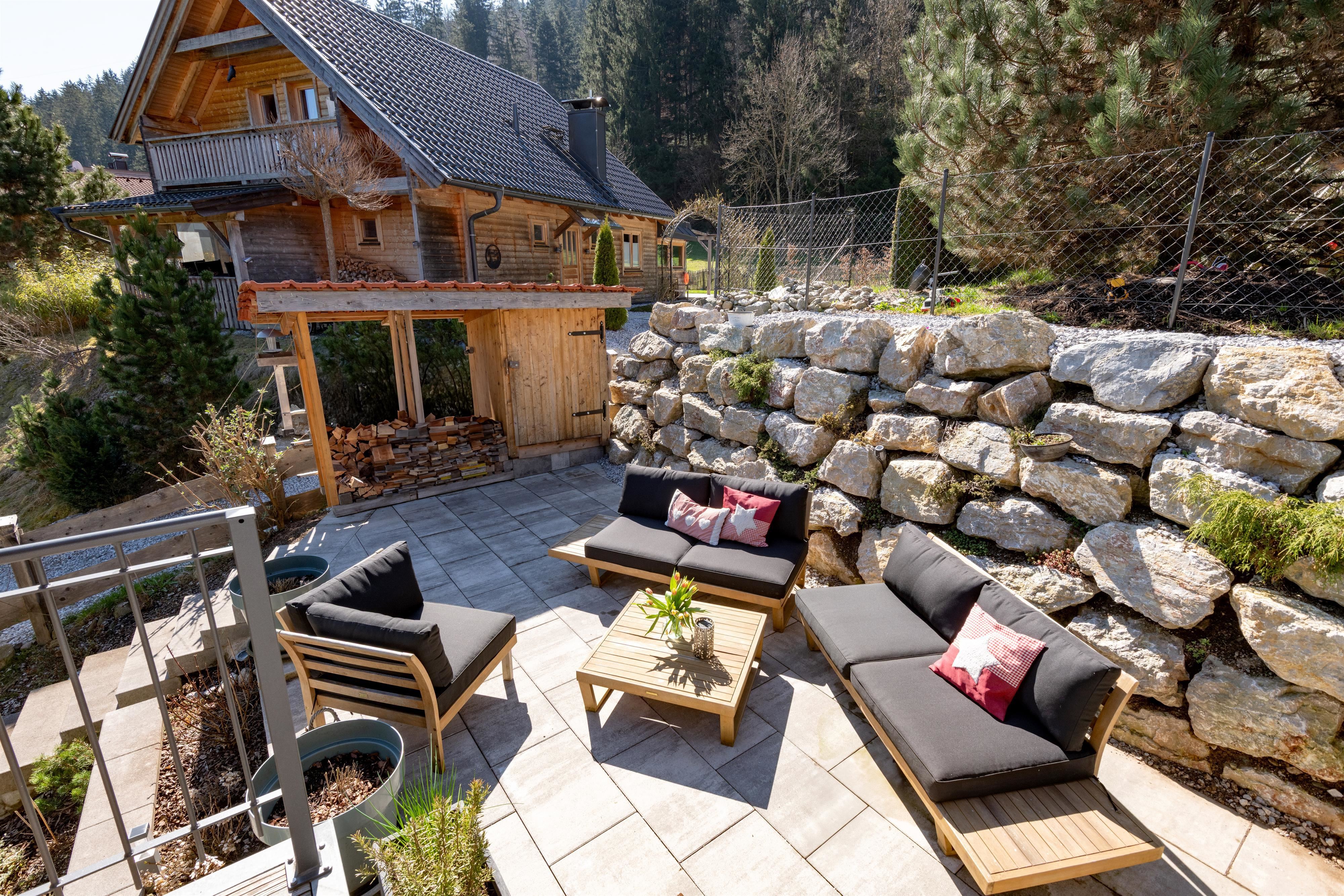 Het terras dat is uitgerust met een tafel, stoelen, parasol en hangmat, nodigt niet alleen uit tot ontspanning in de buitenlucht, maar biedt ook een prachtig uitzicht op de Wilde Kaiser, waardoor je de neiging krijgt om nog een paar extra foto's te maken.