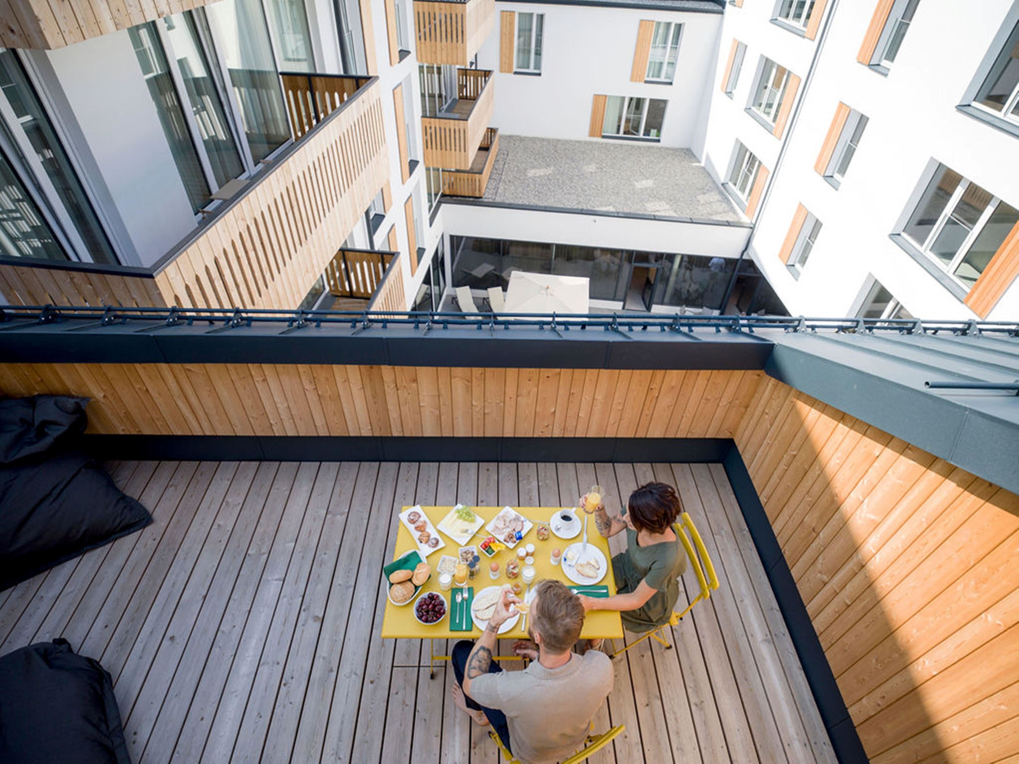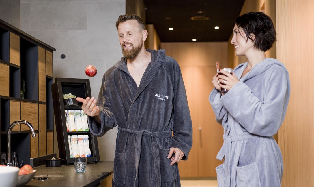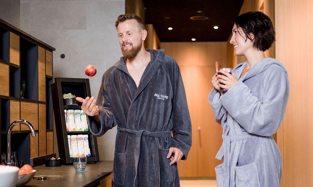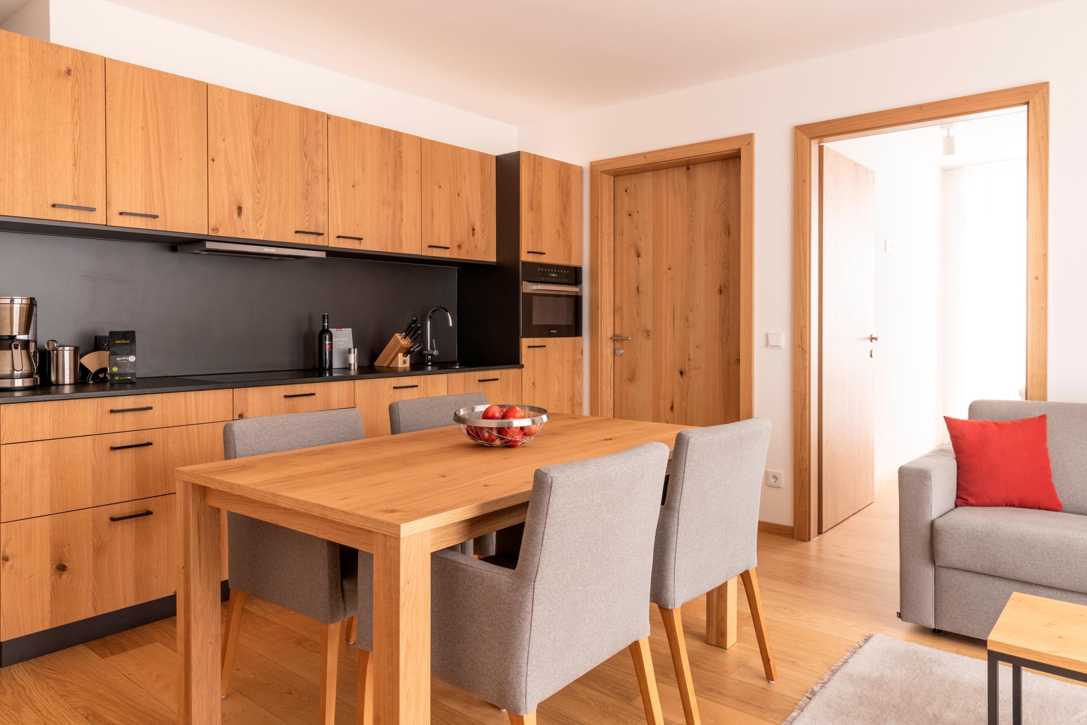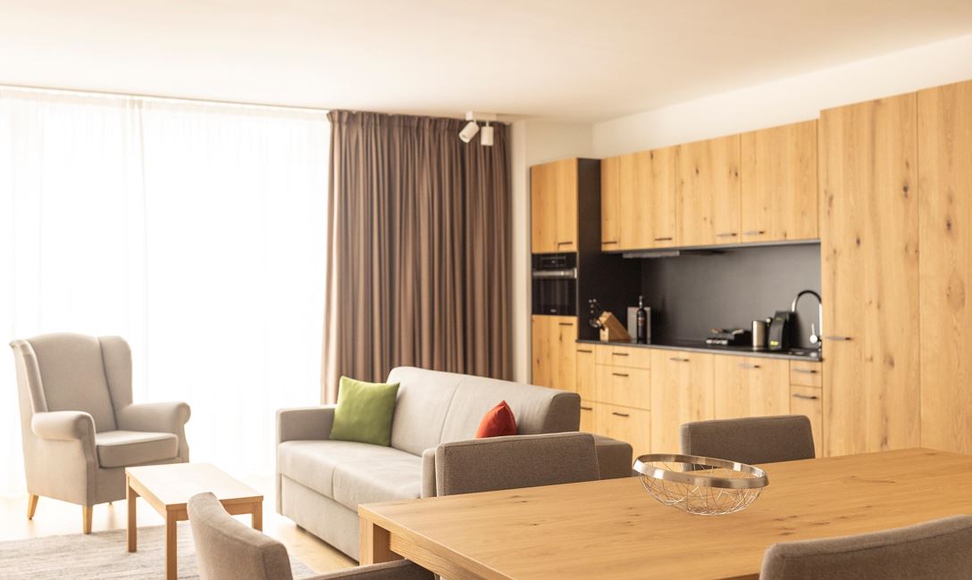 Beste uitrusting, lichte woonruimte, woonkeuken met eettafel, houten parketvloeren, woongedeelte met uitschuifbank, sat-tv, gratis wifi, balkon of terras, ruime slaap- en badkamers, slaapkamer met scheidbaar bed, kluis, badkamer met douche/wc, föhn, badtas met badjas, slippers en badhanddoek, volledig uitgeruste keuken, vaatwasser, koelkast, keramische kookplaat, combimagnetron, pannen, servies en bestek, koffiezetapparaat, broodrooster