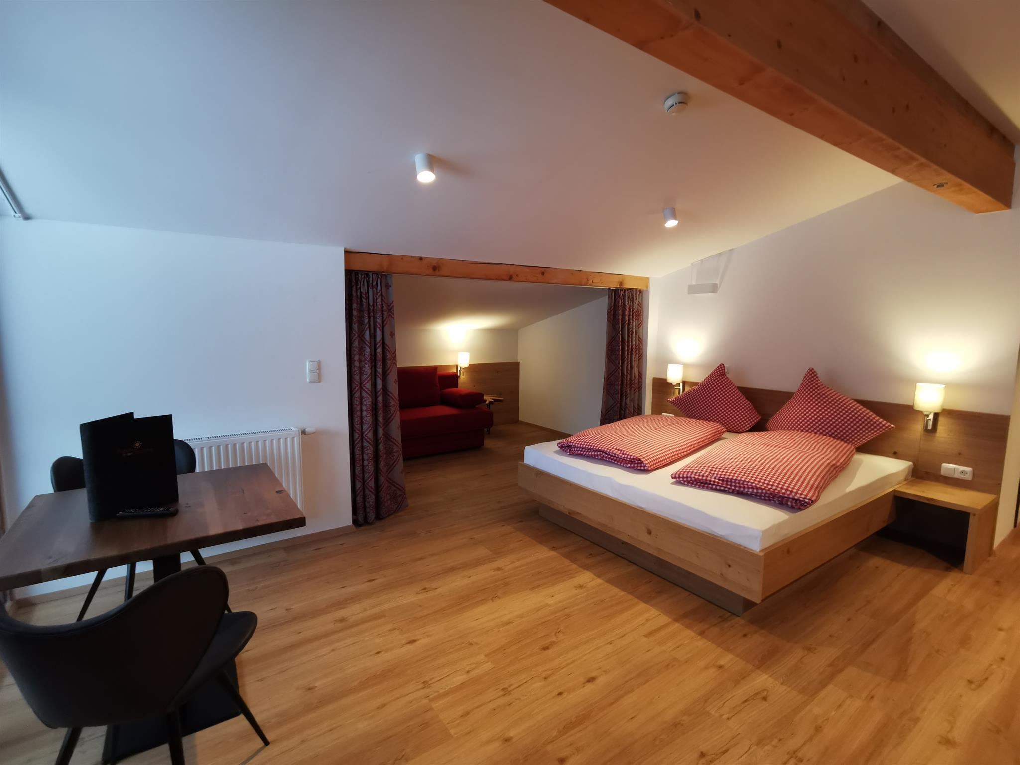 Onze familiekamer op de begane grond met ruime badkamer is recentelijk gerenoveerd en beschikt over een ouderslaapkamer (voorzien van zitgelegenheid, kabel-tv, gratis wifi en toegang tot een terras op het zuiden) en een aparte slaapkamer met een comfortabele dubbele uitschuifbank - ideaal voor gezinnen met kinderen!